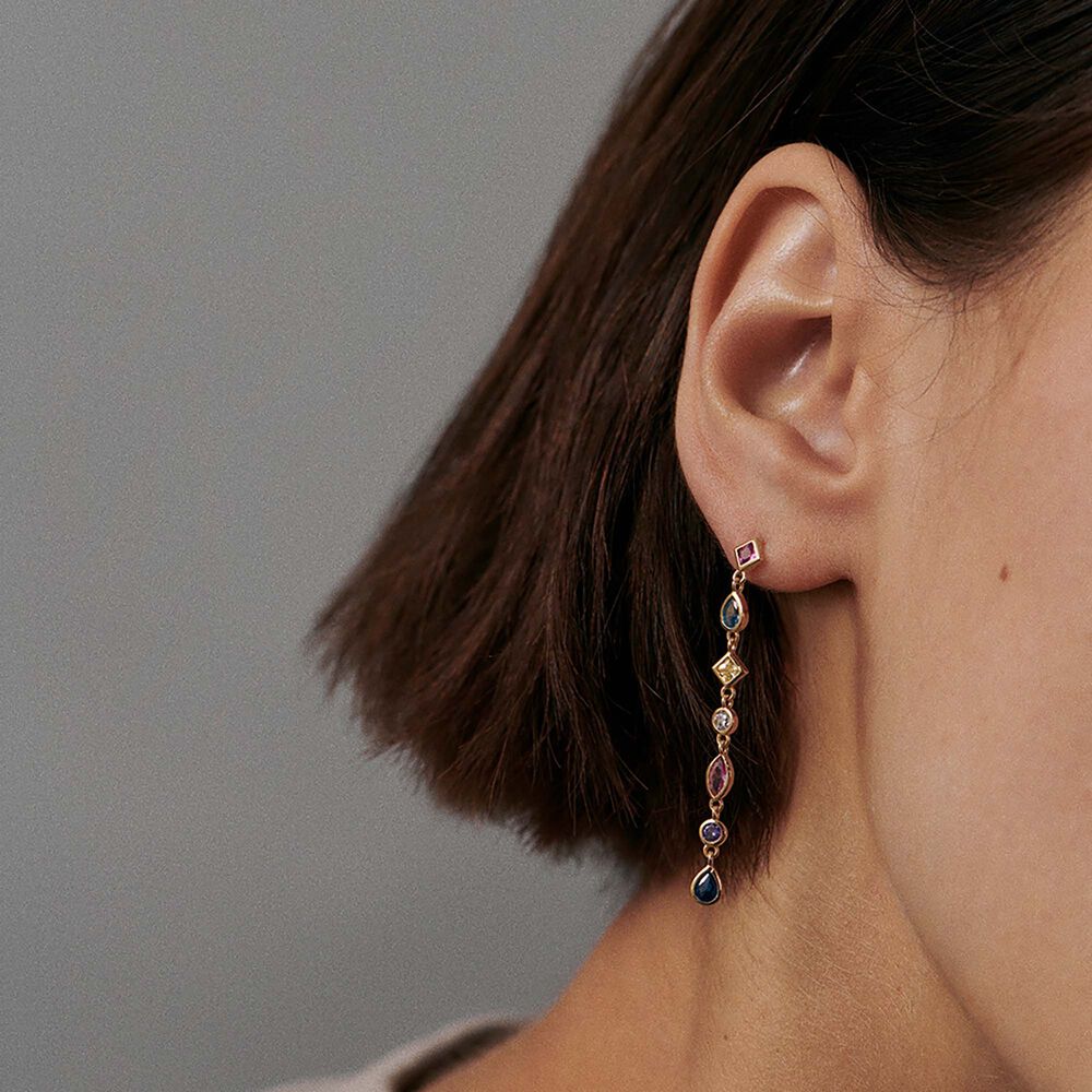 Boucles d'oreilles longues en laiton doré 750/1000 avec des oxydes de zirconium de différentés formes.