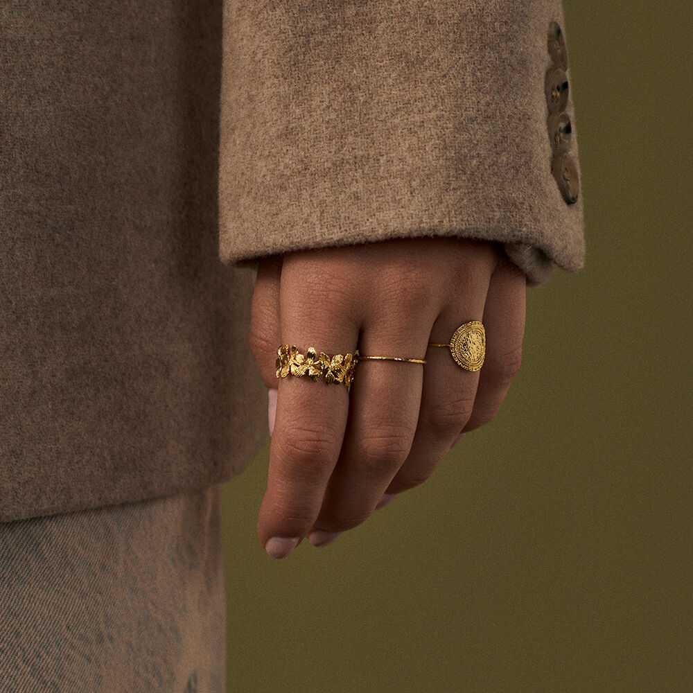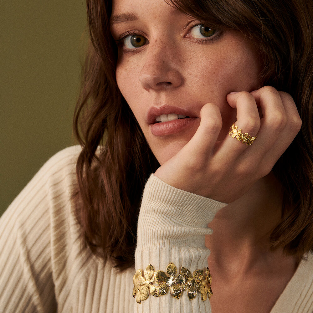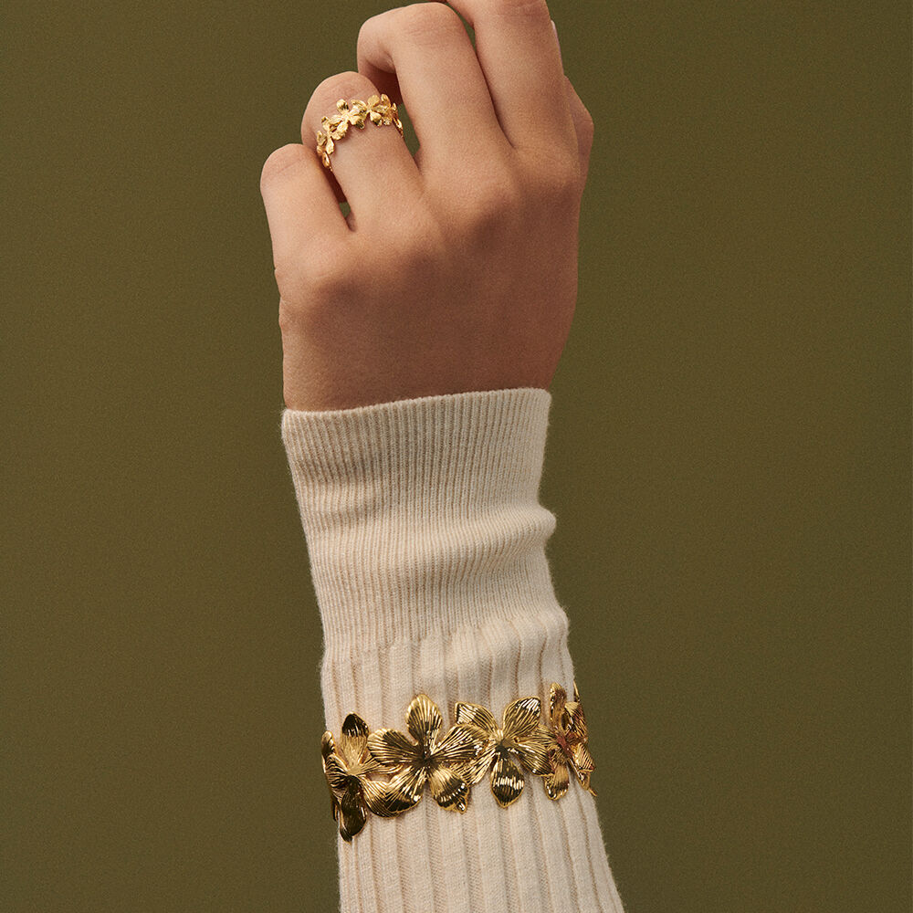 Bague ajustable, en laiton doré 750/1000, multitude de petites fleurs surperposées.