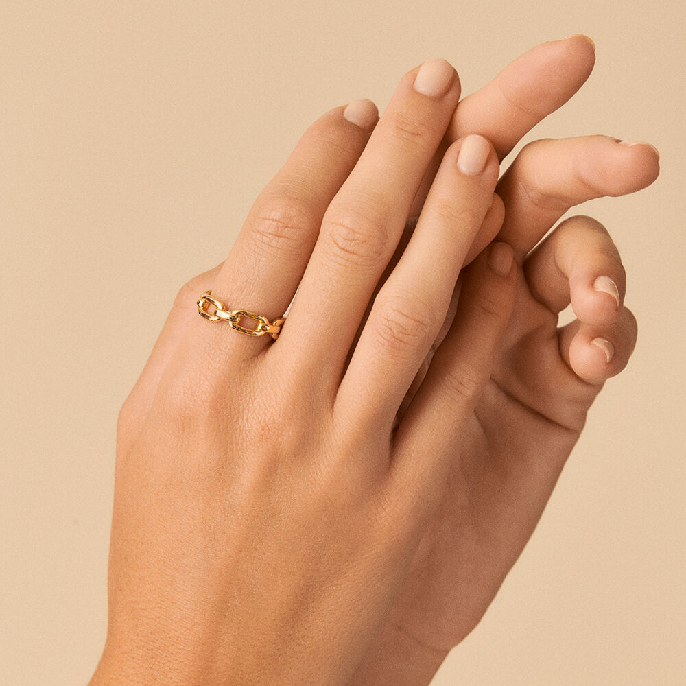 Bague ouverte en laiton plaqué or formée d'une maille rectangulaire rigide. PM: 48/50 - MM: 52/54 - GM: 56/58.