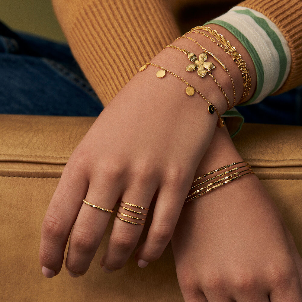Bague tonneau, en laiton doré à l'or fin, constituée de 4 rangs filaires dont une partie est enfilée de perles métal.