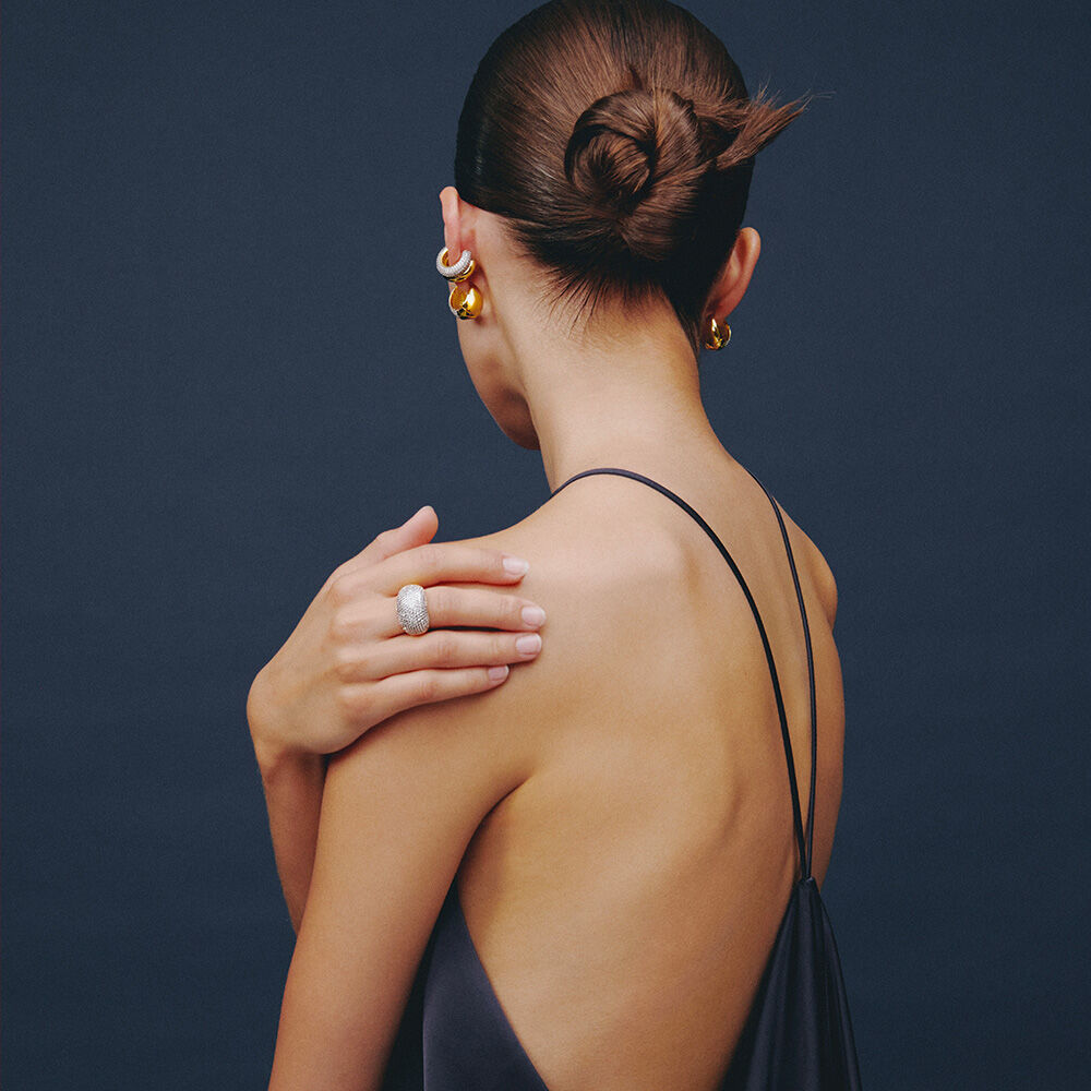 Cette bague dôme de notre collection DANAE, imaginée à Paris, est réalisée en laiton doré à l'or 750/1000e et ornée d'oxydes de zirconium.Cette bague simple et épurée est sertie d'oxydes pour un look plus chic. Elle peut s'associer avec d'autres bijoux de notre collection permanente DANAE.