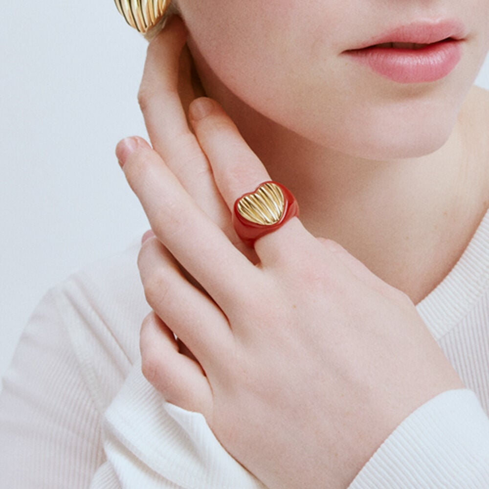 Bague avec coeur en métal strié de notre collection SACRE COEUR, imaginée à Paris, réalisée en laiton doré à l'or 750/1000e - 18 carats et résine. Elle est disponible en couleur ivoire ou rouge. L’aspect marbré implique de possibles variations de couleur d’un modèle à l'autre.