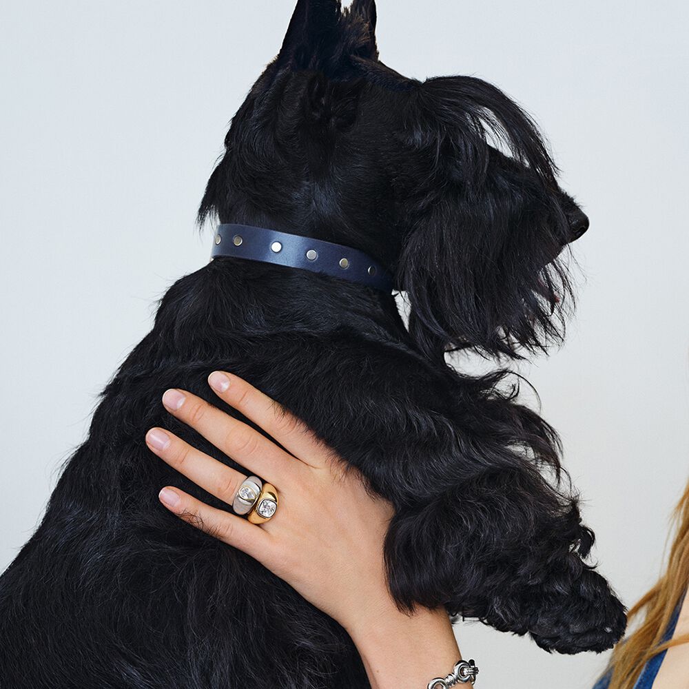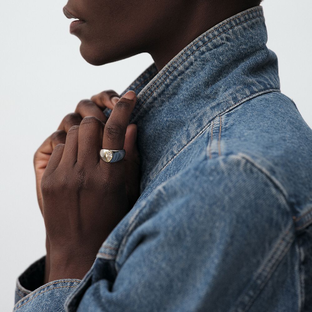 Bague bombée, en laiton rhodié, oxyde de zirconium en forme de coeur souligné par une bordure en laiton doré 750/1000.