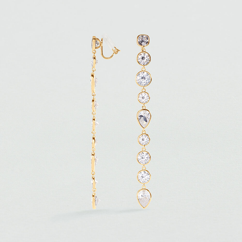 Boucles d'oreilles pendantes à clip XL de notre collection CANDY, imaginées à Paris, sont réalisées en laiton dorées à l'or 750/1000e et ornées d'oxydes de zirconium. Boucles d’oreilles pour oreilles non percées avec système clip.