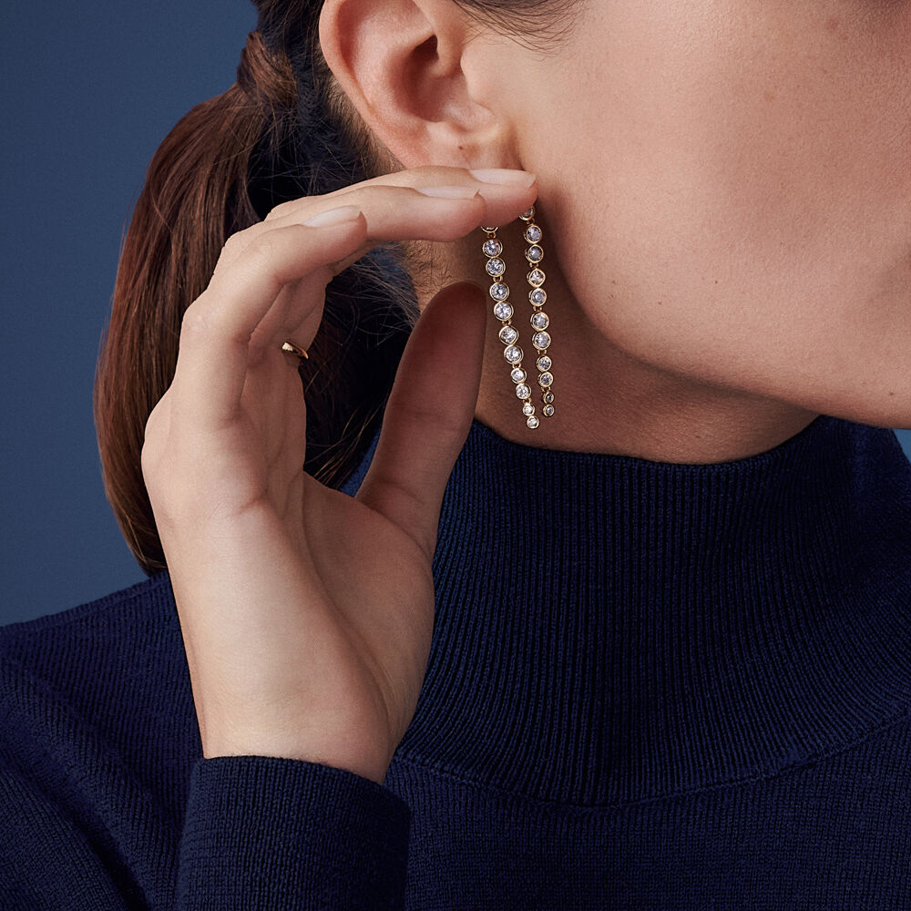 Boucles d'oreilles longues et linéaires, en laiton doré 750/1000, chaine tennis d'oxydes de zirconium sertis clos.
