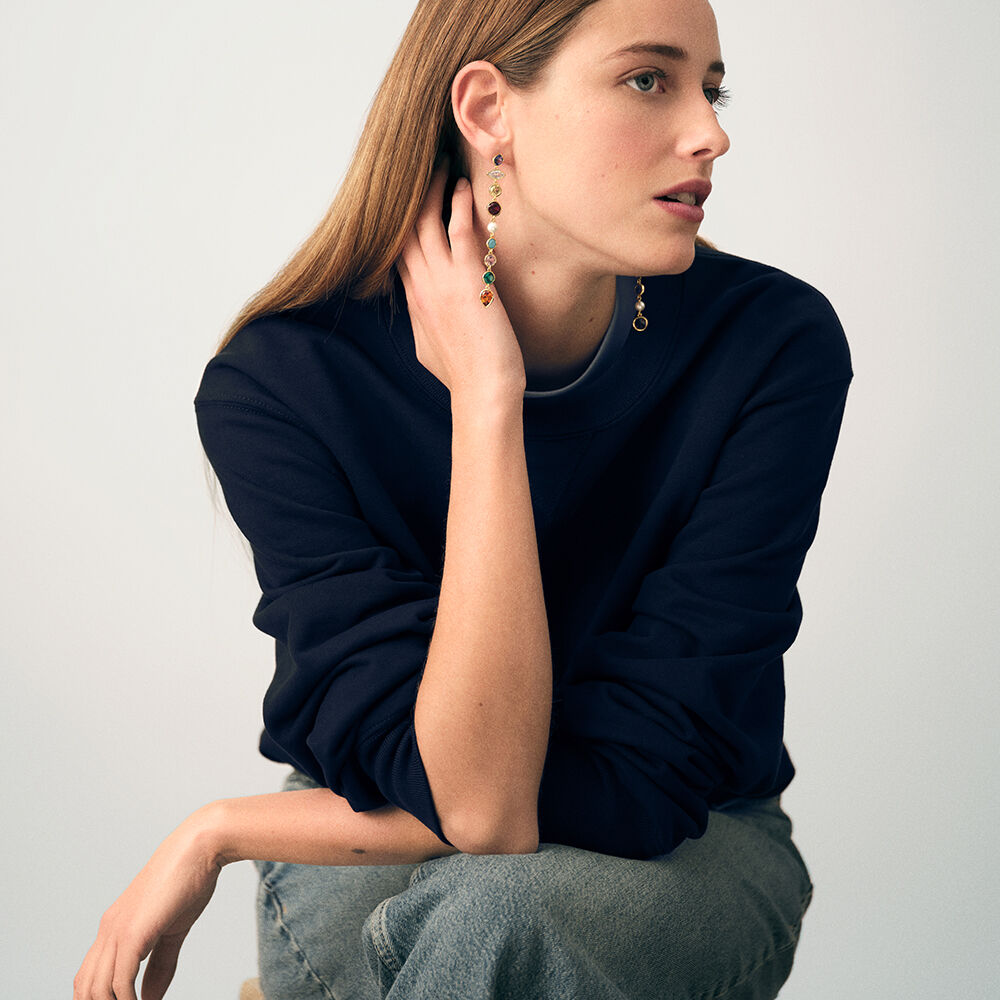 Boucles d'oreilles longues en laiton doré 750/1000 faites d'oxydes de zirconium de multiple couleurs.