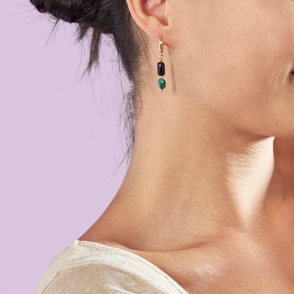Mini créoles, en laiton doré à l'or fin, pierres reconstituées de différentes formes.