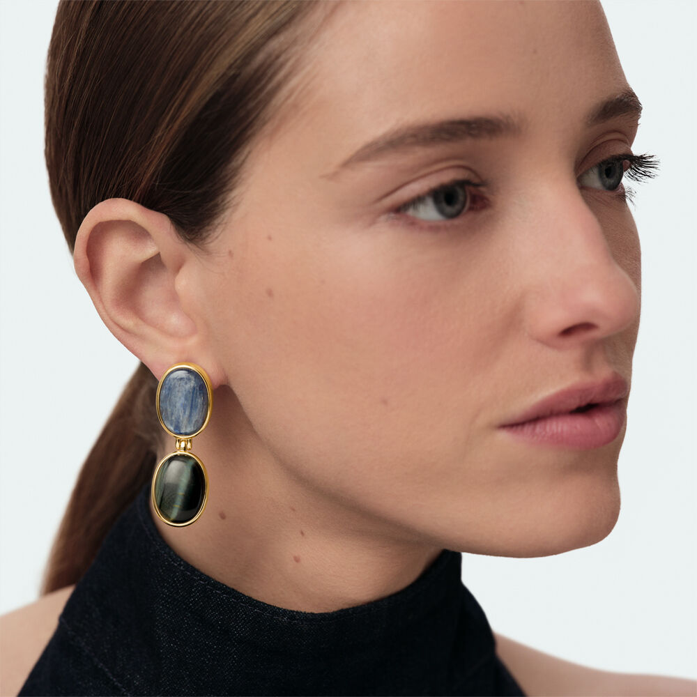 Doubles boucles d'oreilles de notre collection RIVIERA, imaginées à Paris, réalisées en laiton doré 750/1000e - 18 carats et ornées de kyanite et oeil d'aigle. Cette collection iconique met en valeur les pierres naturelles.
