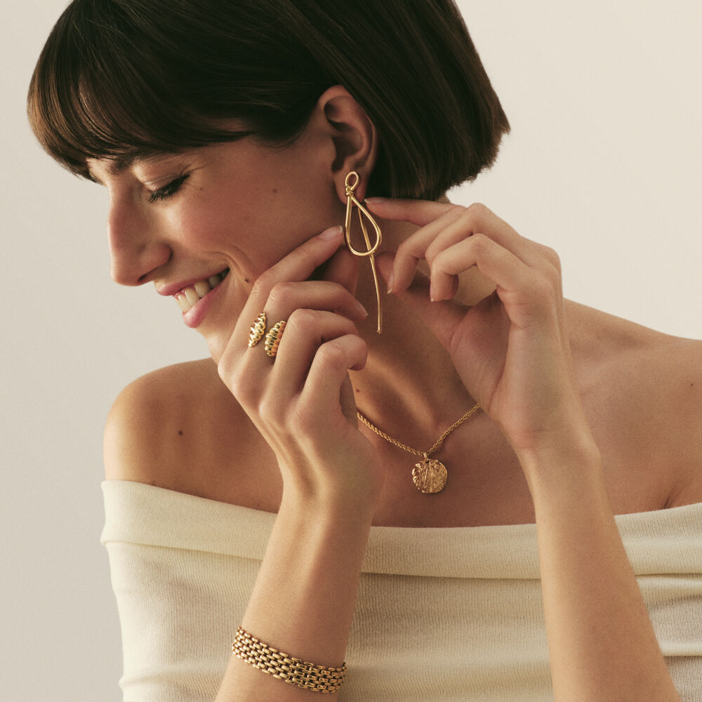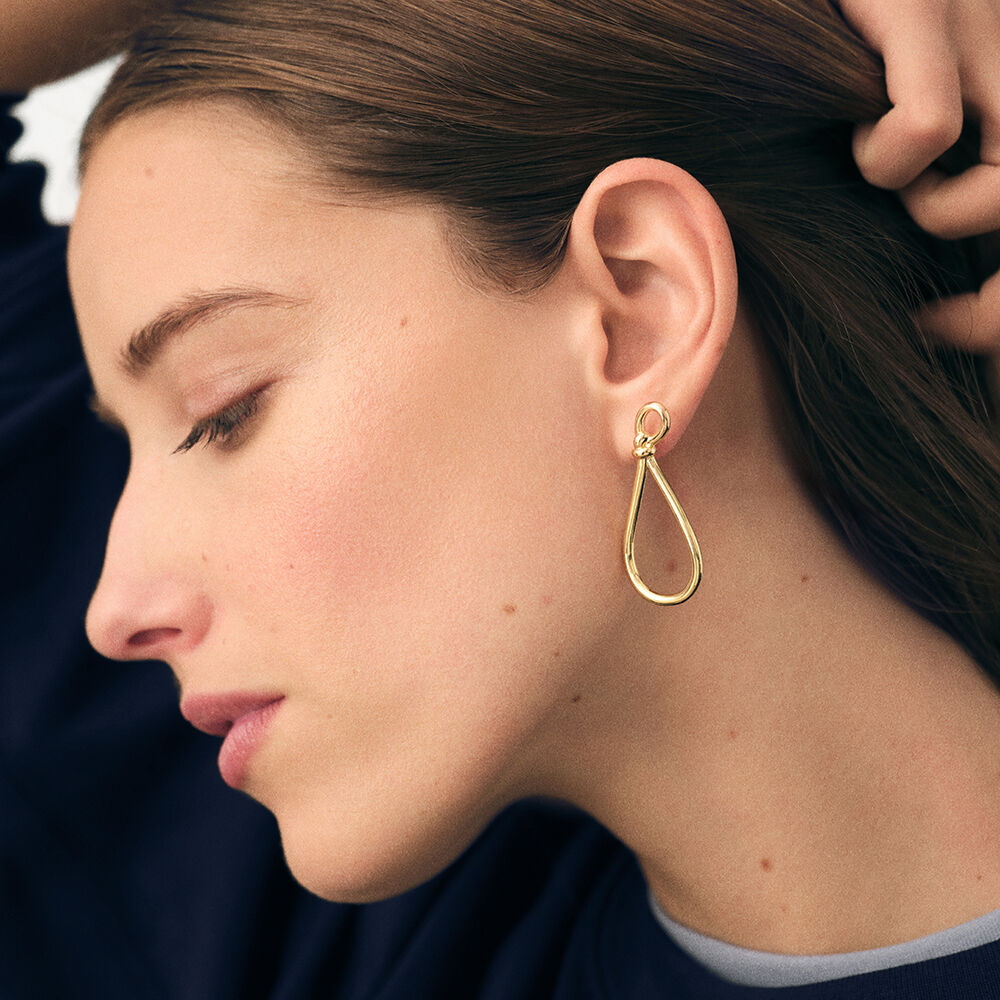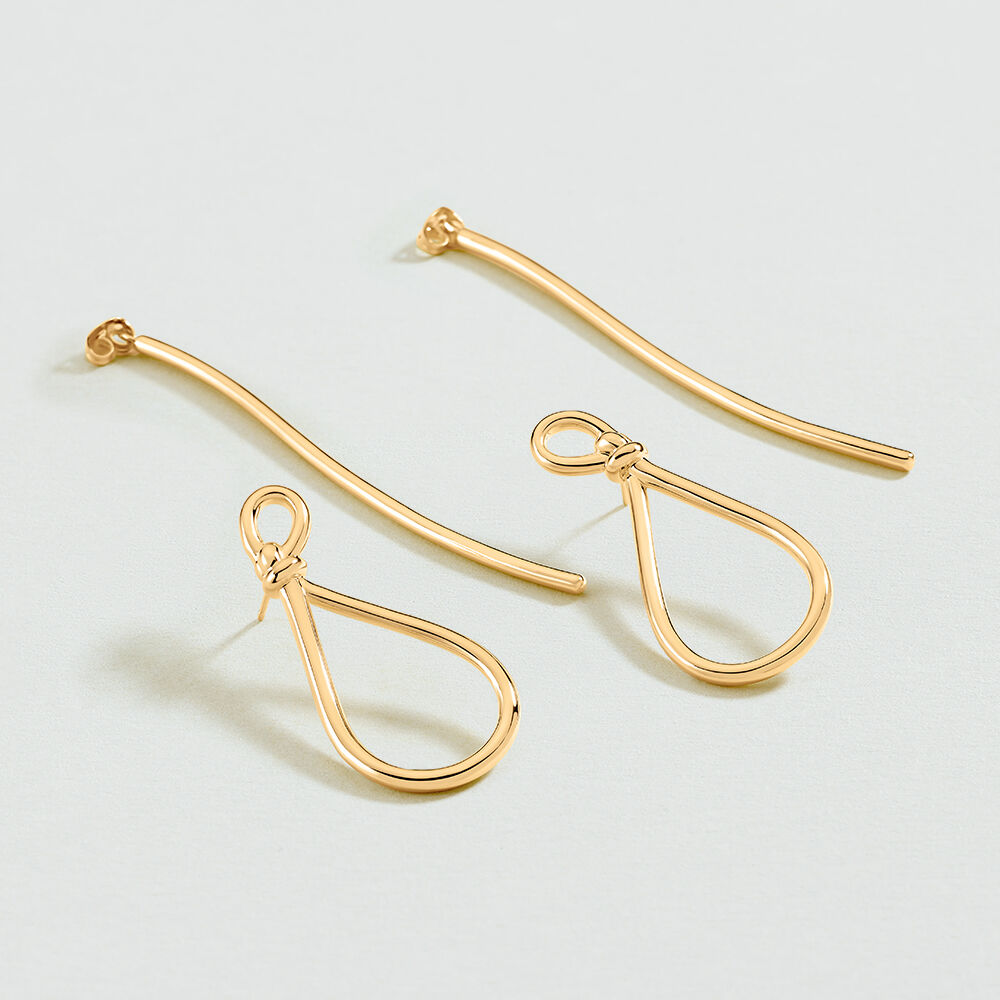Boucles d'oreilles longues en laiton doré 750/1000 en forme de nœuds pouvant se porter avec ou sans la tige au dos.