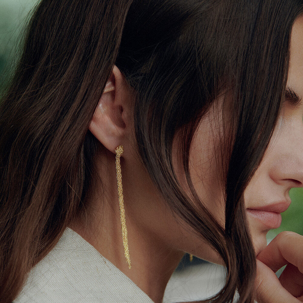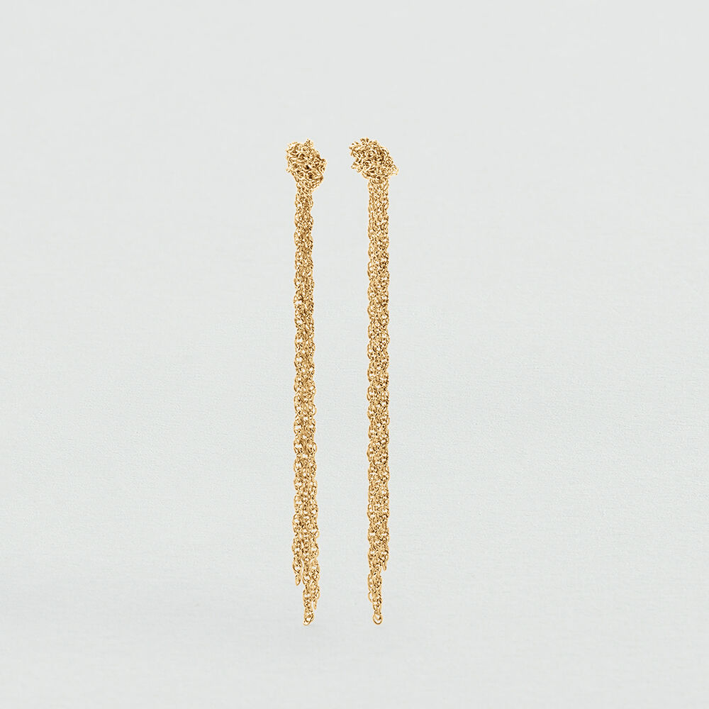 Boucles d'oreille longues en pompons de chaîne en laiton doré à l'or fin.