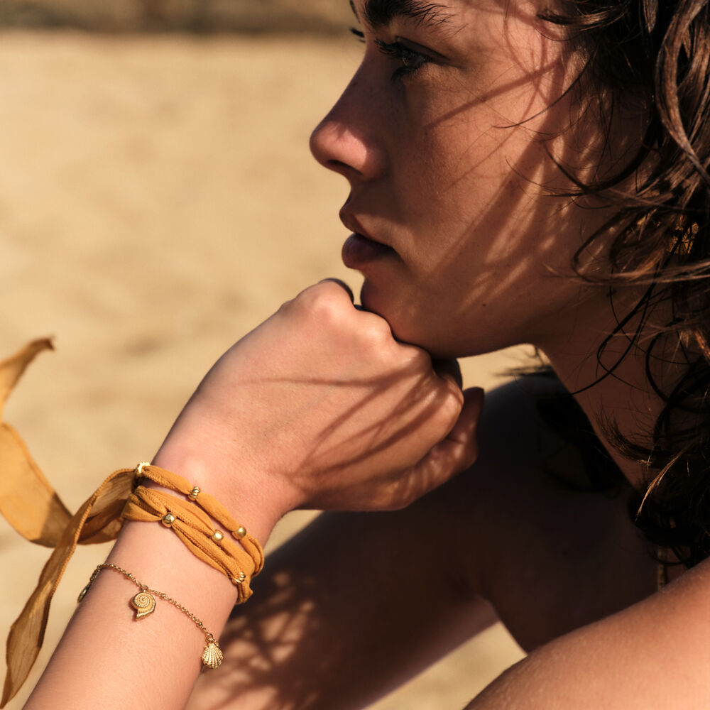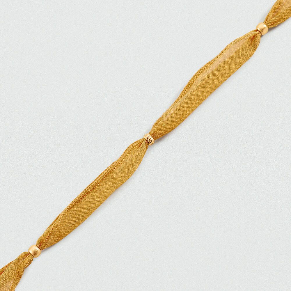 Bracelet en soie colorée avec perles dorées. Idéal à accumuler pour un look boho chic irrésistible tout l’été. Vous ne voudrez plus le quitter !.