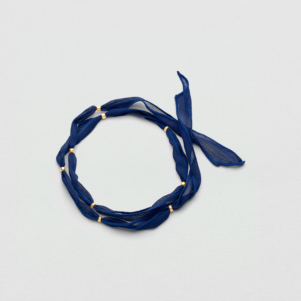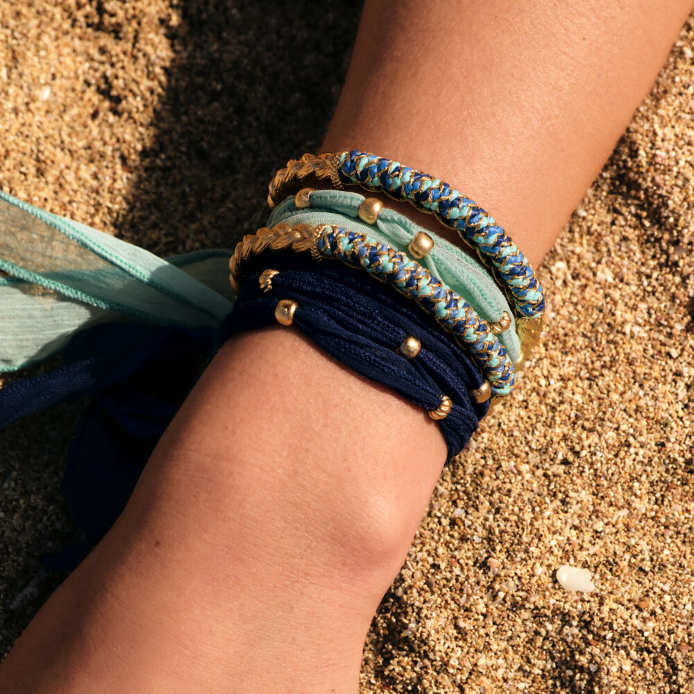 Bracelet en soie colorée avec perles dorées. Idéal à accumuler pour un look boho chic irrésistible tout l’été. Vous ne voudrez plus le quitter !.