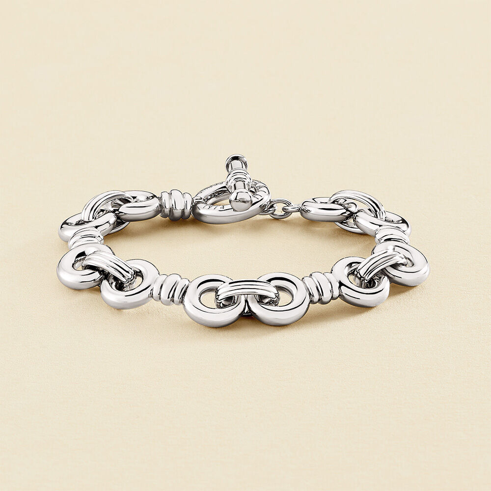 Bracelet, en laiton rhodié, sections d'anneaux articulées, fermoir barette emblématique.