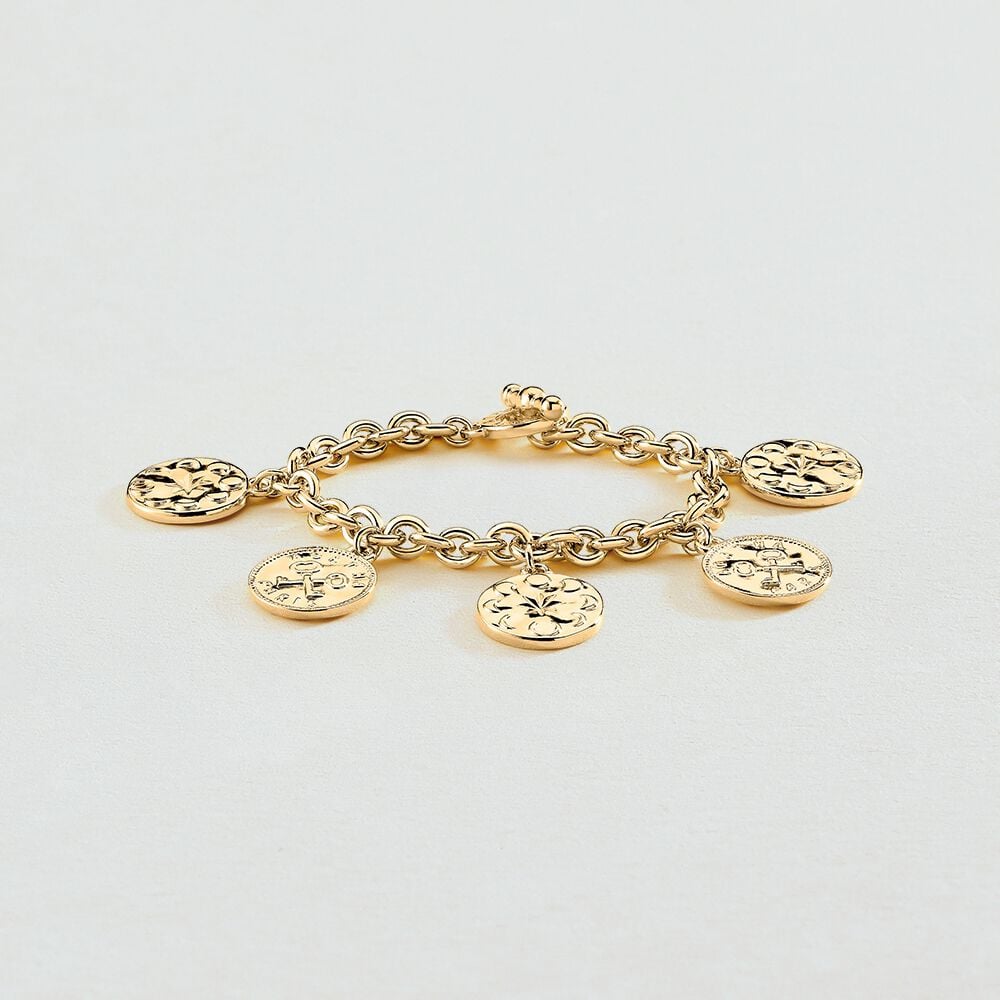 Bracelet breloques, en étain doré 750/1000, 5 médailles 2 clés croisées d'un côté et cycle lunaire de l'autre, fermoir bâtonFabriqué dans nos ateliers parisiens, chaque pièce de la ligne St Honoré est minutieusement dessinée, sculptée à la main, dorée par un procédé artisanal, puis assemblée manuellement pour garantir une qualité et une durabilité optimales. Un bijou unique qui porte l’héritage et l’élégance intemporelle d’Agatha..