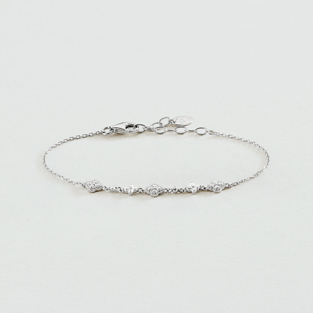 Bracelet de notre collection BELOVED, imaginé à Paris, en argent 925 rhodié, monté d'une rangée de fleurs pavées d'oxydes de zirconium. Ce bijou mesure 150 mm auquel s’ajoute une rallonge de 30 mm