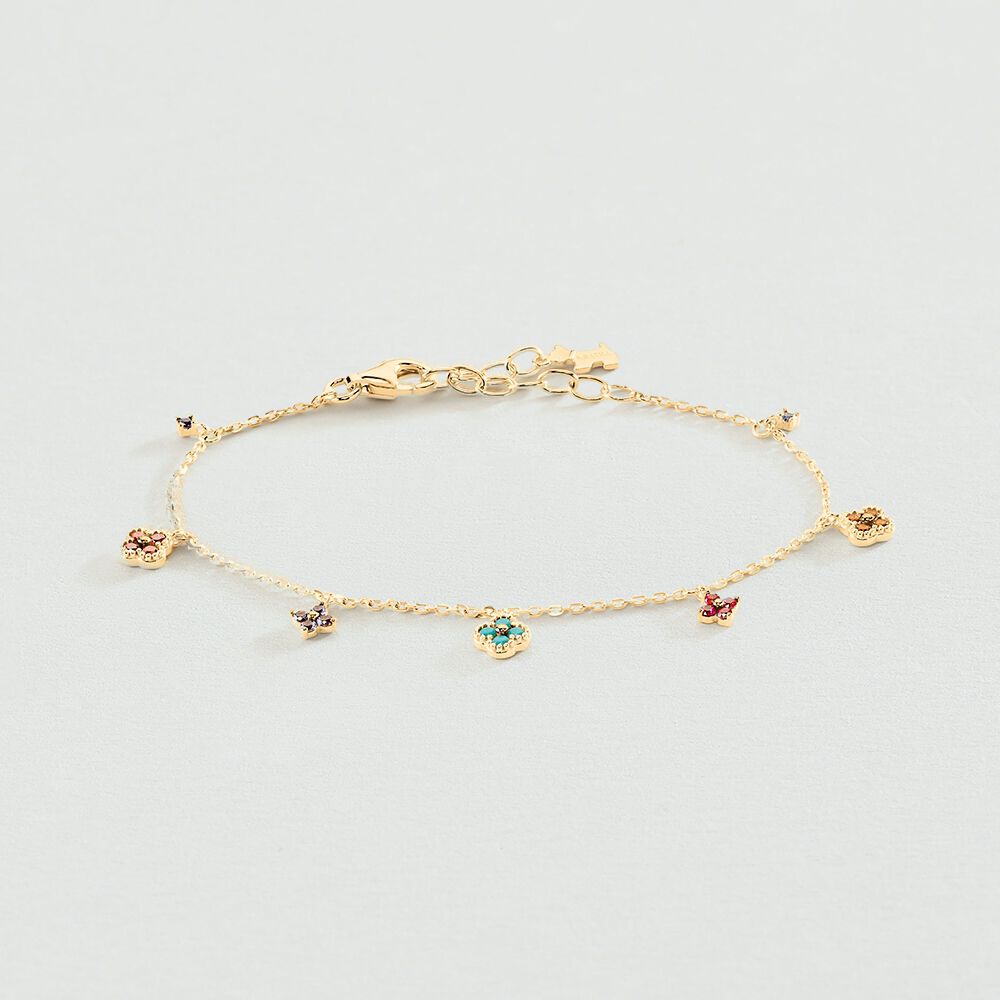Bracelet chaine, en argent véritable doré 750/1000, avec des fleurs d'oxydes de zirconium en pampille et un fin graineti sur le pourtour. Ce bijou mesure 150mm et contient une rallonge de 30mm
