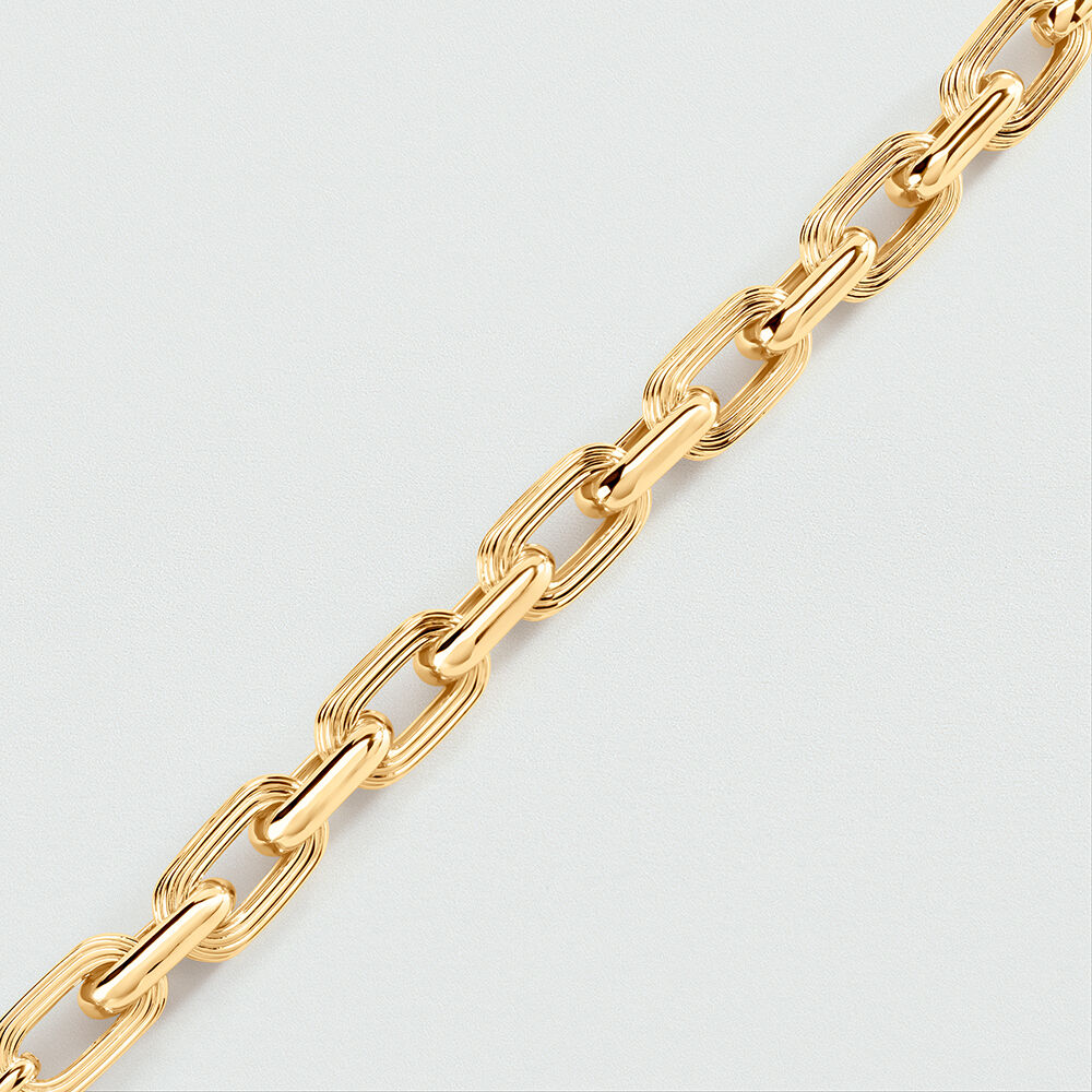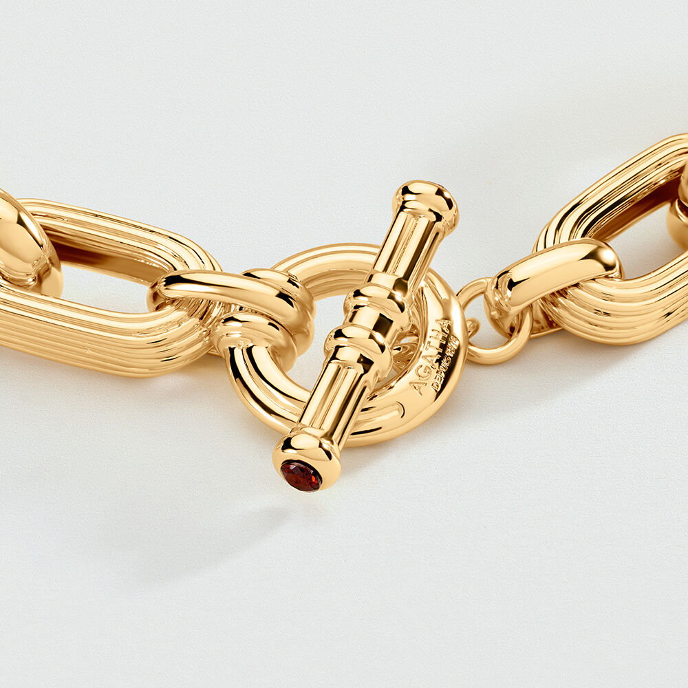 Ce bracelet de notre collection HAUSSMANN, imaginé à Paris, est réalisé en laiton doré à l’or 750/1000e – 18 carats et orné d’oxydes de zirconium sur le fermoire.Ce bracelet reprend une collection archive d’Agatha, inspirée de l’univers Art Déco. Sa texture striée et son look tendance sublimeront vos tenues.