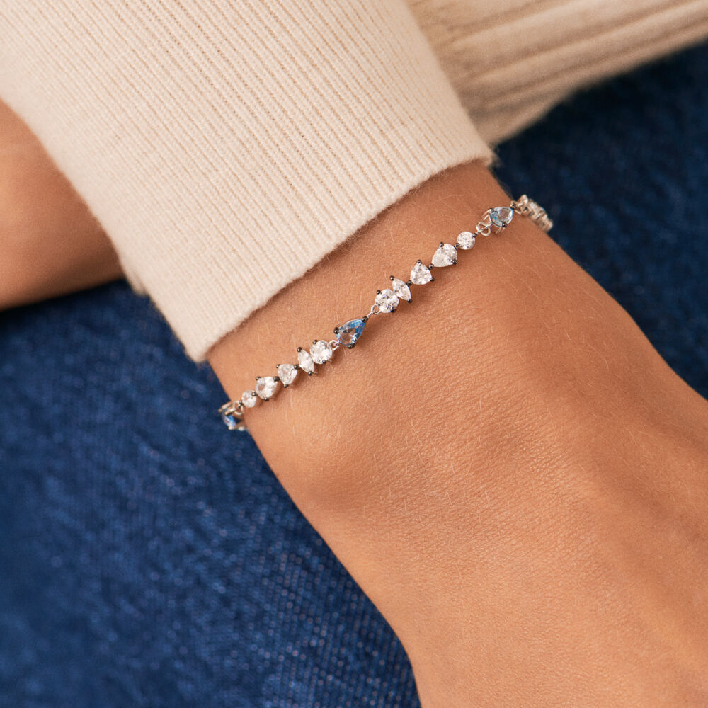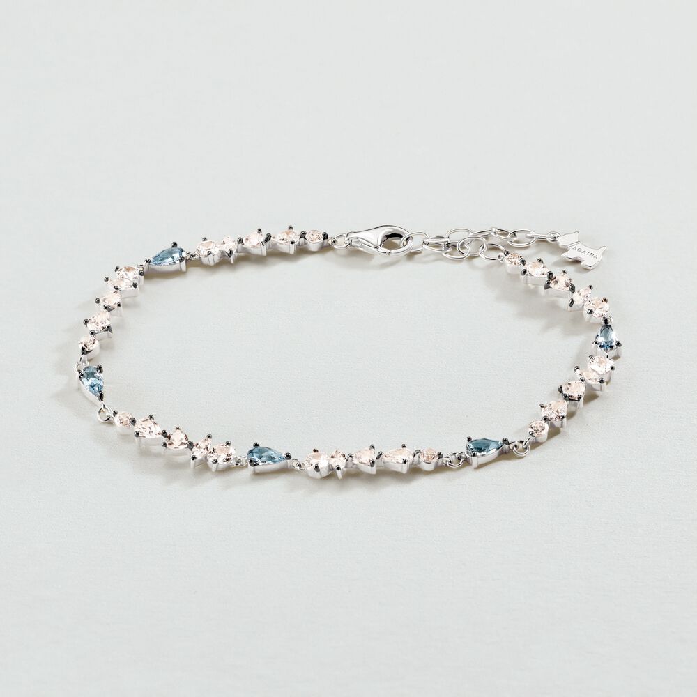 Bracelet en argent 925/1000 fait de rangés oxydes de zirconium cristal entrecoupé d'oxydes de zirconium couleur aquamarine. .