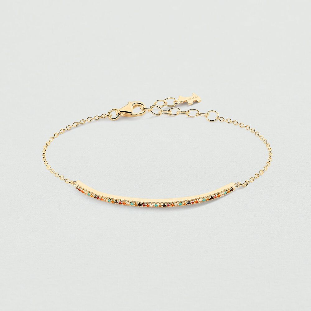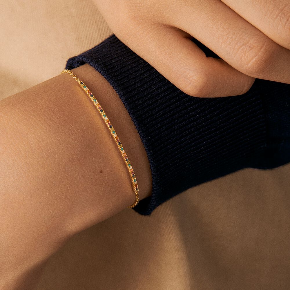 Bracelet souple en argent véritable doré 750/1000 avec une section pavée d'oxydes de zirconium multicolores. Ce bijou mesure 150mm et contient une rallonge de 30mm