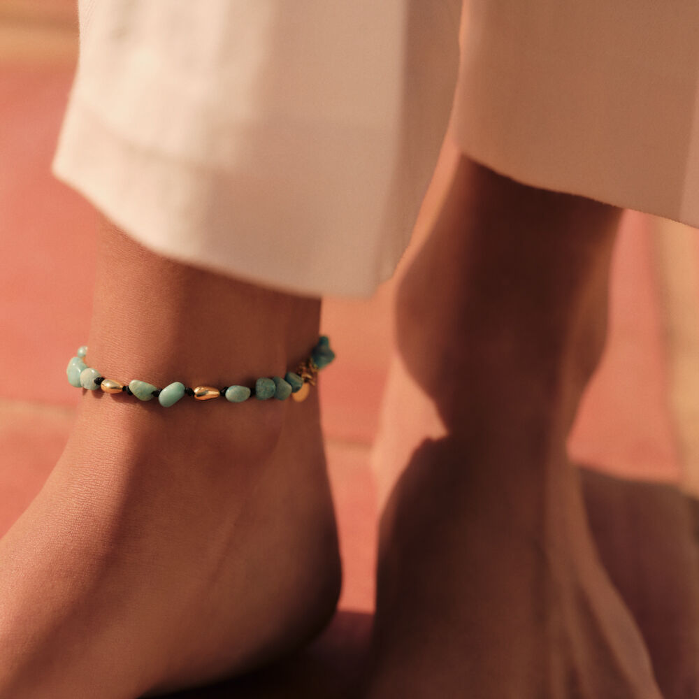 Chaine de cheville en acier et pierres naturelles. Une pièce estivale pleine de fraîcheur, conçue pour ajouter une touche de couleur à toutes vos silhouettes.