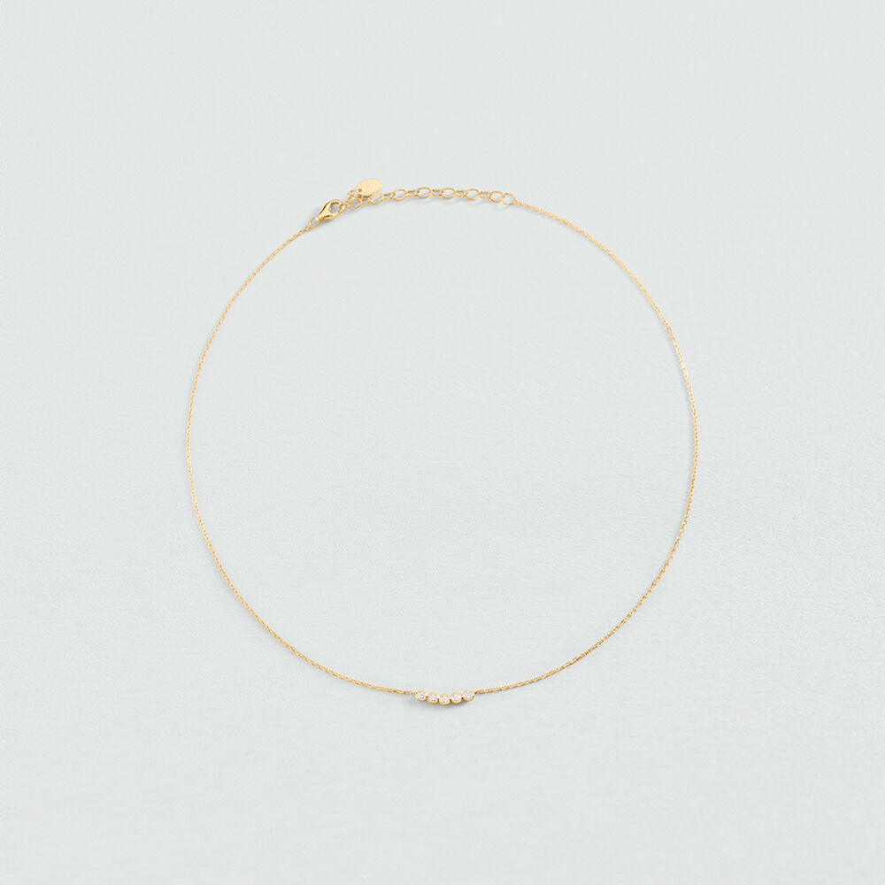 Collier de notre collection ODEON, imaginé à Paris, réalisé en argent 925 doré à l'or 750/1000e - 18 carats et orné d'oxydes de zirconium ou de spinelle synthétique, en sertis clos . Il est disponible en couleur cristal ou vert. Cette collection au design épuré est inspirée des codes classiques de la joaillerie. Ce bijou mesure 375 mm auquel s’ajoute une rallonge de 50 mm