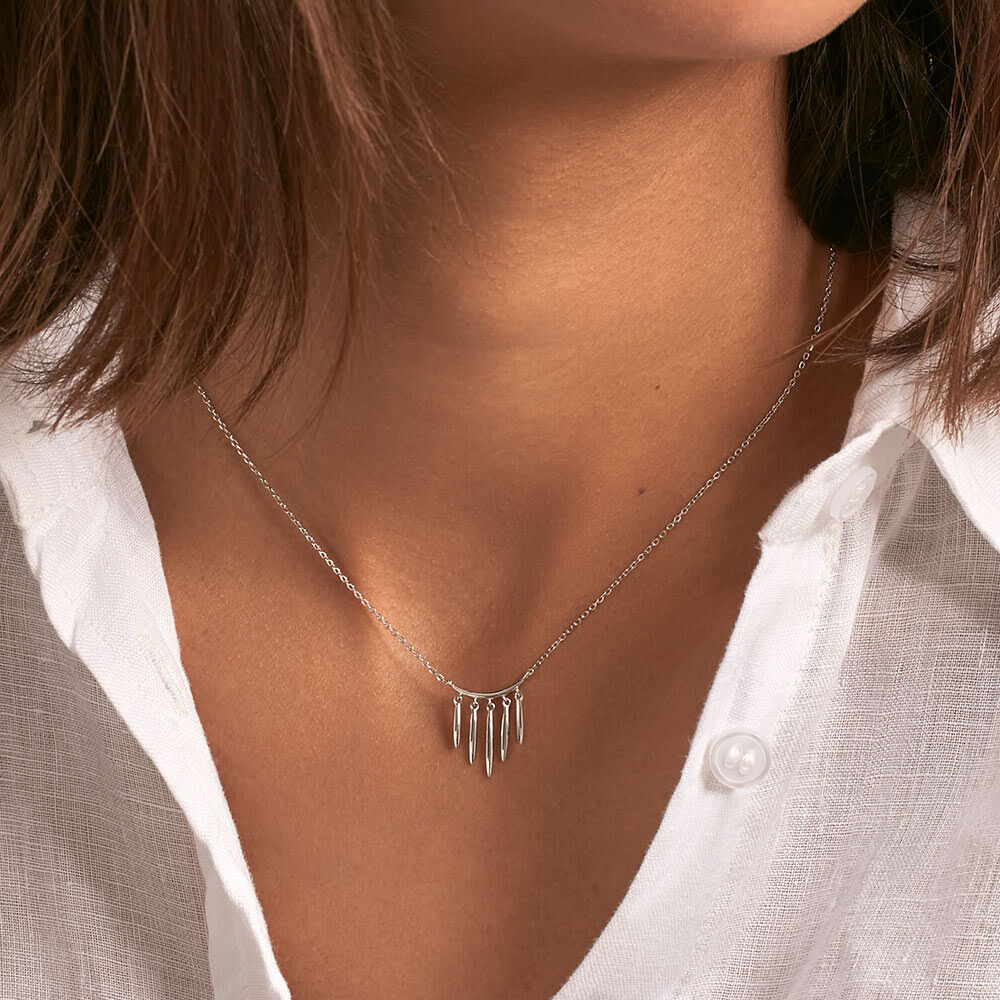 Collier mi-long, en argent véritable 925/1000, avec, en pendentif, un rideau de pampilles rayonnantes..