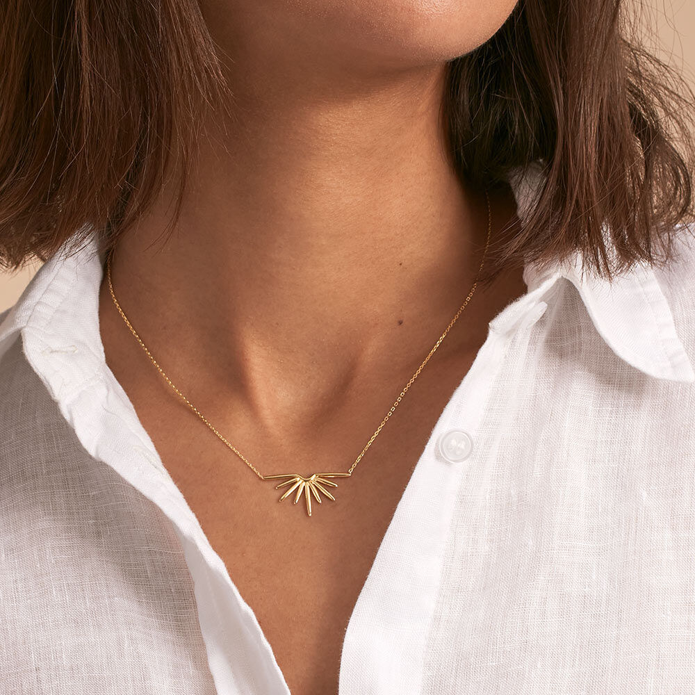 Collier mi-long, en argent véritable 925/1000 doré 750/1000, dont le pendentif est un éventail rayonnant. .