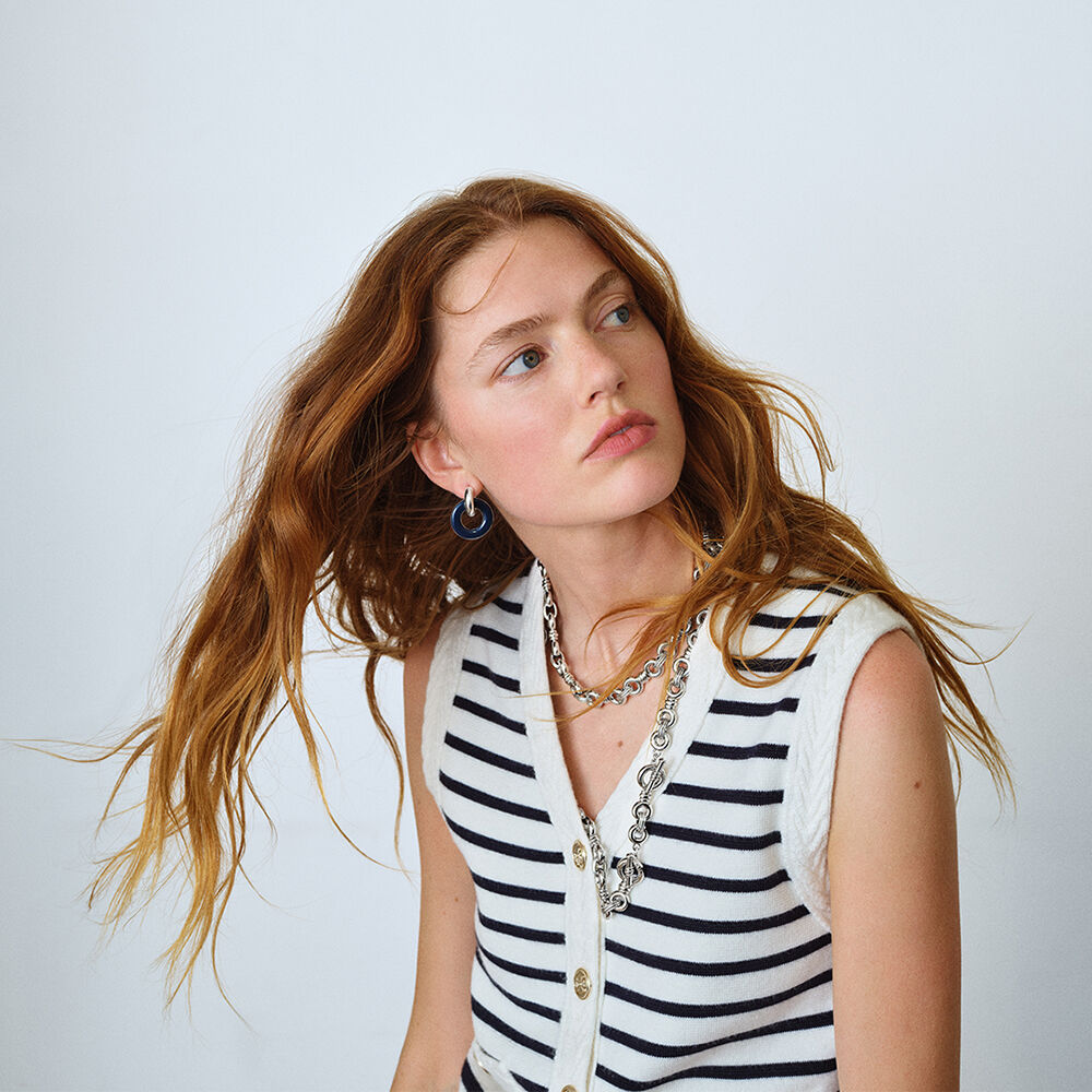 Collier court, en laiton rhodié, sections d'anneaux articulées, fermoir barette emblématique. Ce collier est ajustable grâce à sa partie amovible..