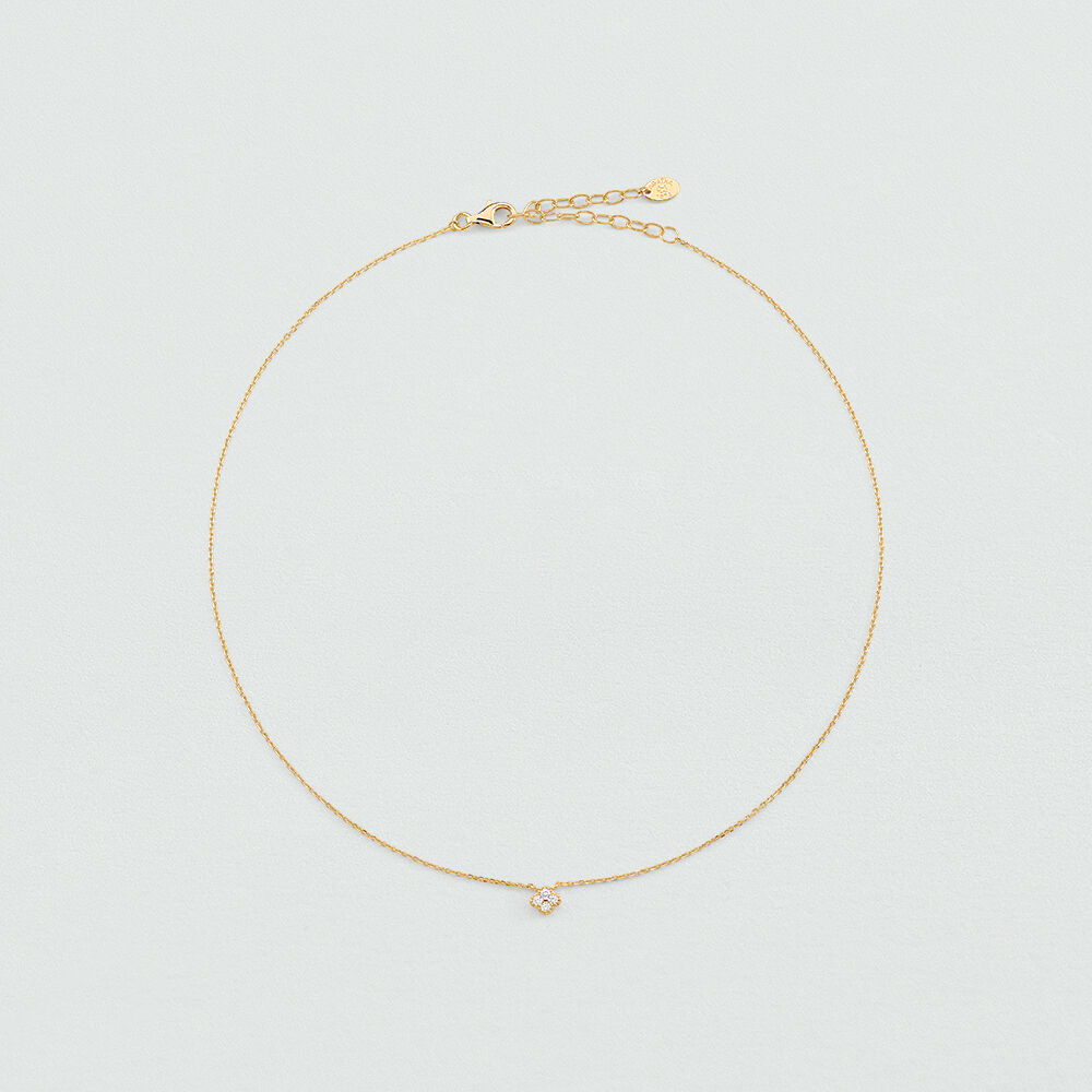 Collier, en argent véritable doré 750/1000, avec un pendentif en forme de fleur dont les pétales sont des oxydes de zirconium et dont le pourtour est finement réalisé avec un graineti. Ce bijou mesure 375mm et contient une rallonge de 50mm