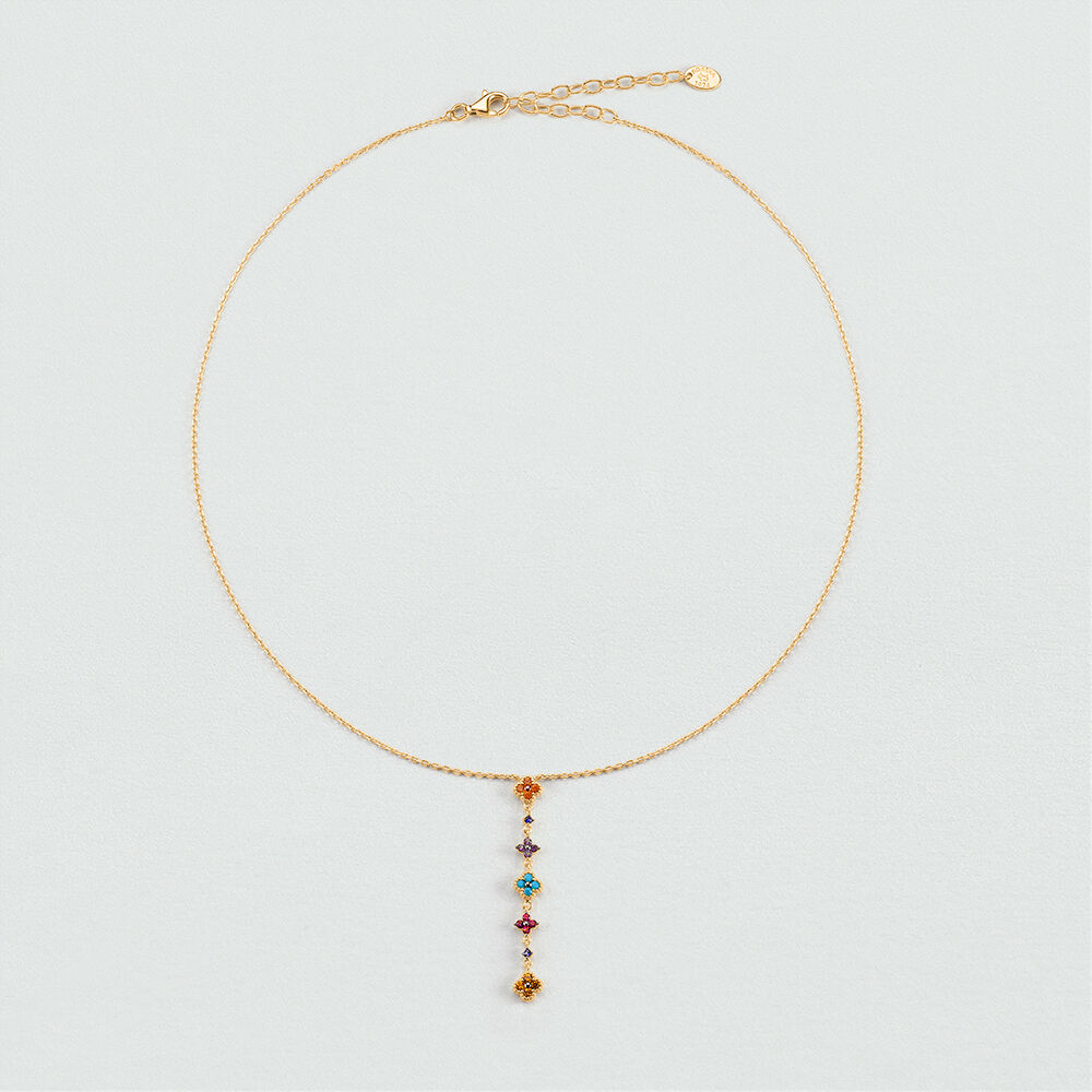 Collier Y en argent 925/1000 doré à l'or 750/1000 avec une rangée de fleurs pavées d'oxydes de zirconium pendantes. . Ce bijou mesure 375mm et contient une rallonge de 50mm