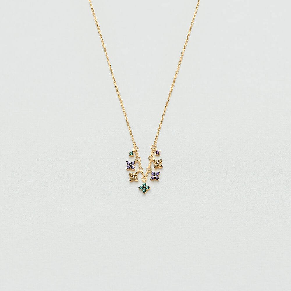 Collier court, en argent 925/1000 doré 750/1000, avec des fleurs d'oxydes de zirconium en pampille.