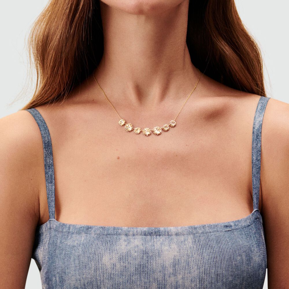 Collier cours en laiton rhodié et doré à l'or 750/1000. Collier orné d'une rangée de fleurs recto verso doré et argenté dont une avec un recto pavé d'oxydes de zirconium.