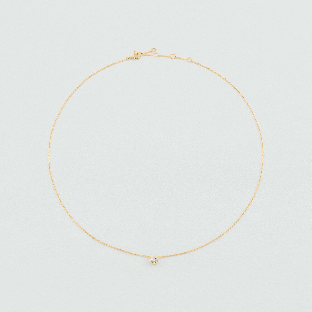 Collier court en argent véritable doré 750/1000, orné d'un oxyde de zirconium serti clos. Ce bijou mesure 375mm et contient une rallonge de 50mm