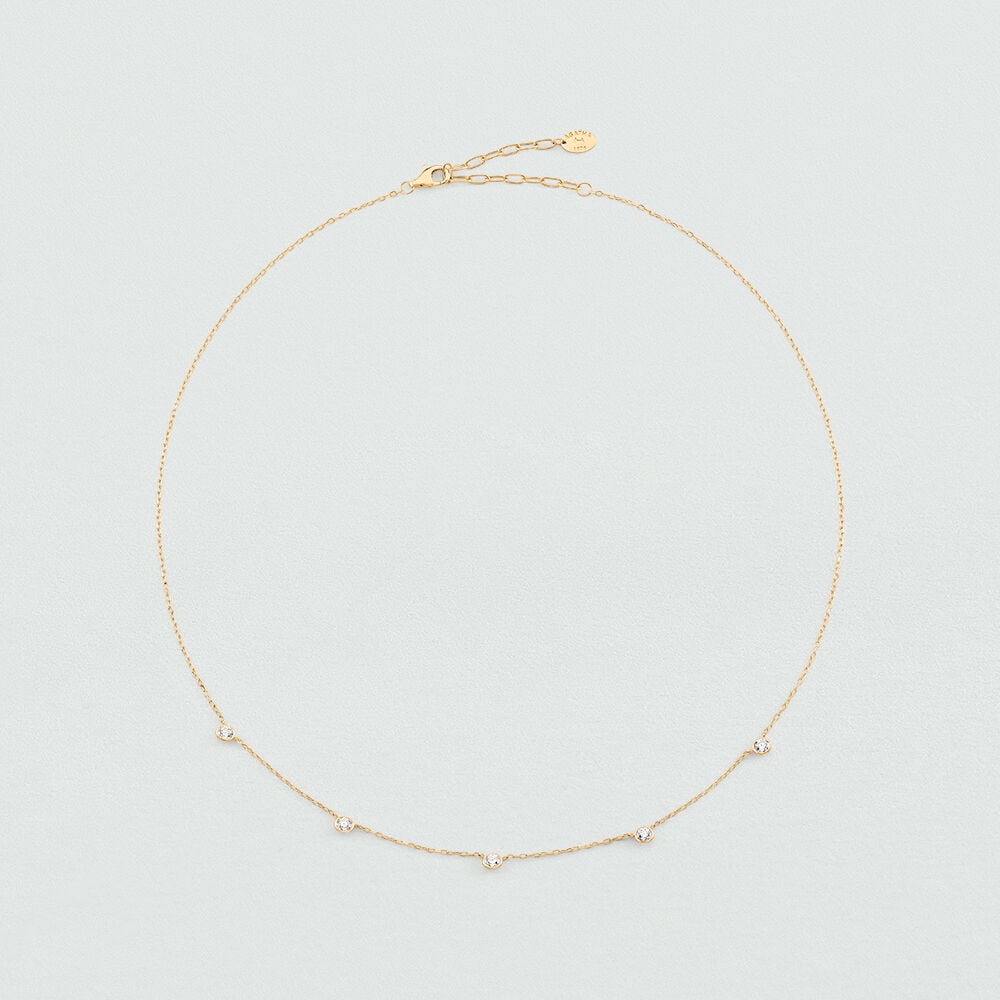 Collier en argent 925/1000 doré à l'or 750/1000 orné de pastilles d'oxydes de zirconium en sertis clos.. Ce bijou mesure 390mm et contient une rallonge de 50mm