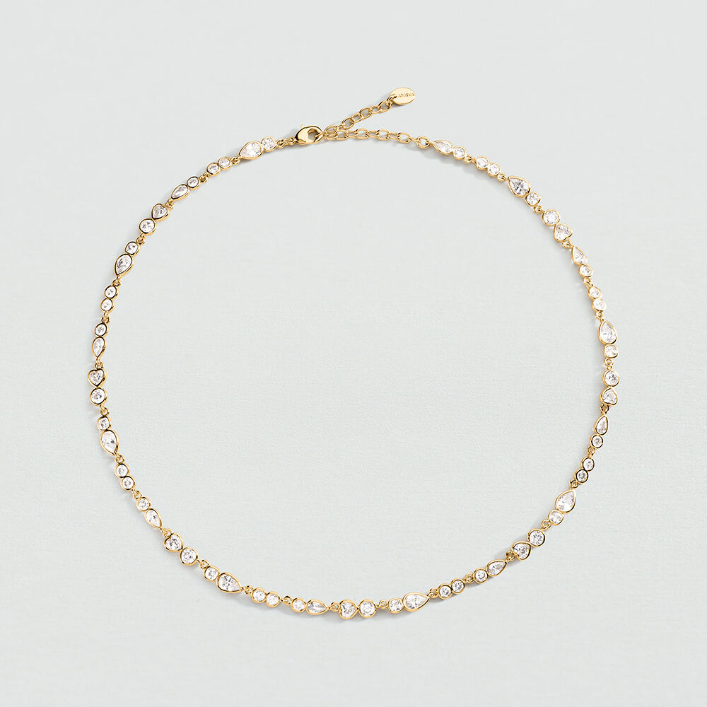 Ce collier de notre collection CANDY, imaginé à Paris, est réalisé en laiton doré à l'or 750/1000e et orné d'oxydes de zirconium. Il est disponible en version multicolore ou cristal. Avec son contour orné d'oxydes en forme de coussin ou de goutte, ce collier permet un look chic, tout en restant discret. Il peut être associé à d'autres bijoux de notre collection permanente CANDY, ou à nos bagues VICTOIRE. Ce bijou mesure 375mm et contient une rallonge de 50mm