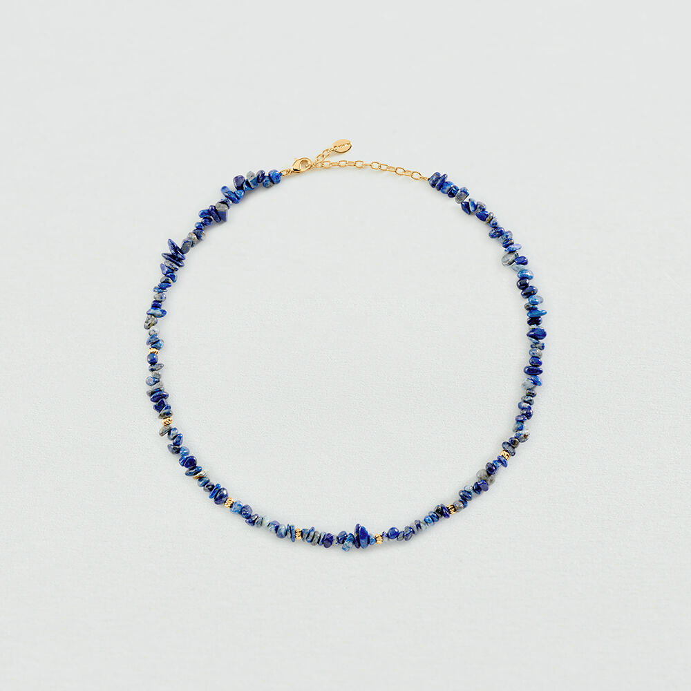 Collier chips de notre collection CASSIS, imaginé à Paris, réalisé en laiton doré à l'or 750/1000e - 18 carats et pierres naturelles. Il est disponible en lapis-lazuli ou corail reconstitué. Ce bijou mesure 375 mm auquel s’ajoute une rallonge de 50 mm