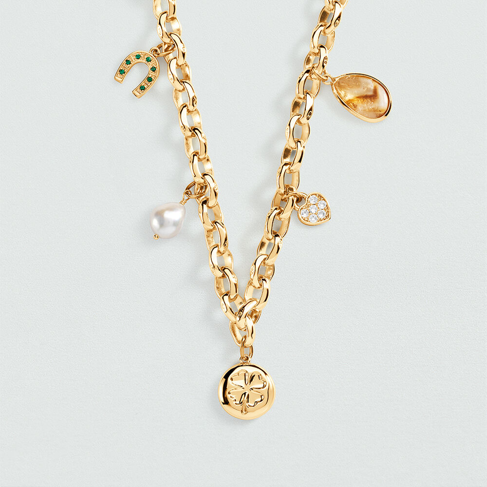 Collier en laiton doré à l’or fin 18K, composé d’une maille épaisse martelée et orné de cinq pendentifs emblématiques d’Agatha. Les pendentifs sont les suivants : un fer à cheval serti d’oxydes de zirconium verts, une perle naturelle, un médaillon porte-bonheur en forme de trèfle à quatre feuilles, un cœur serti d’oxydes de zirconium, et un quartz rutile..