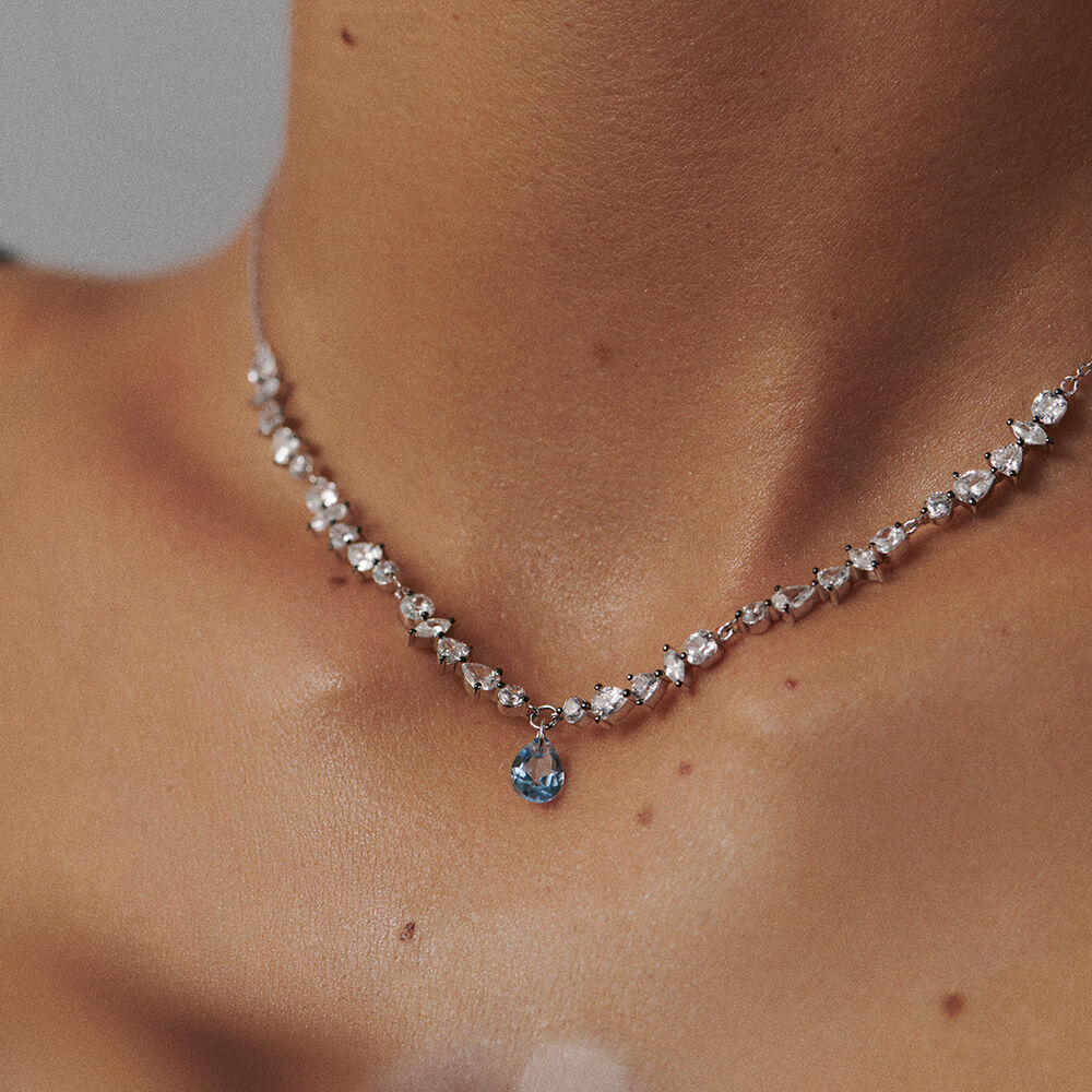Collier en argent 925/1000 fait rangées d'oxyde de zirconium centrées par une pampille d'oxyde de zirconium couleur aquamarine. .
