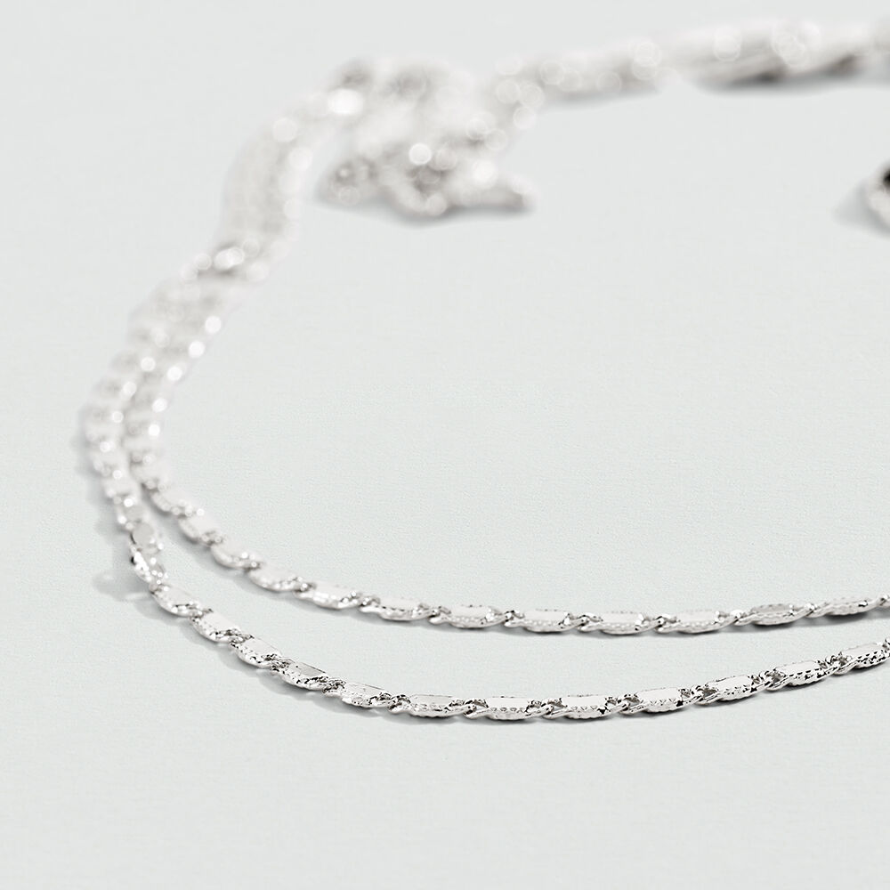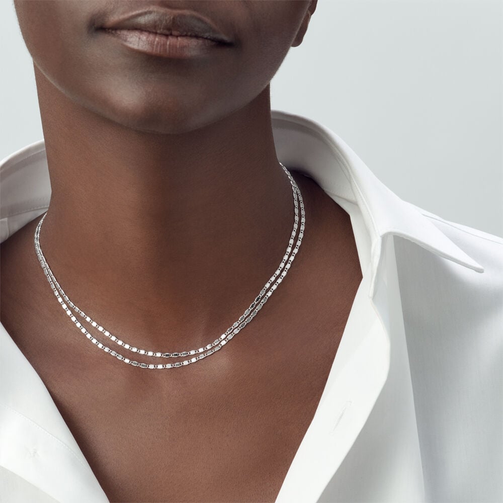 Collier double rang de notre collection JUSSIEU, imaginé à Paris, réalisé en laiton argenté rhodié. Cette chaine miroir offre un look chic, tout en discrétion. Ce bijou mesure 375 mm auquel s’ajoute une rallonge de 50 mm