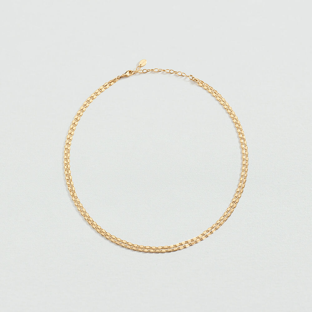 Collier double rang de notre collection JUSSIEU, imaginé à Paris, réalisé en laiton doré à l'or 750/1000e - 18 carats. Cette chaine miroir offre un look chic, tout en discrétion. Ce bijou mesure 375 mm auquel s’ajoute une rallonge de 50 mm