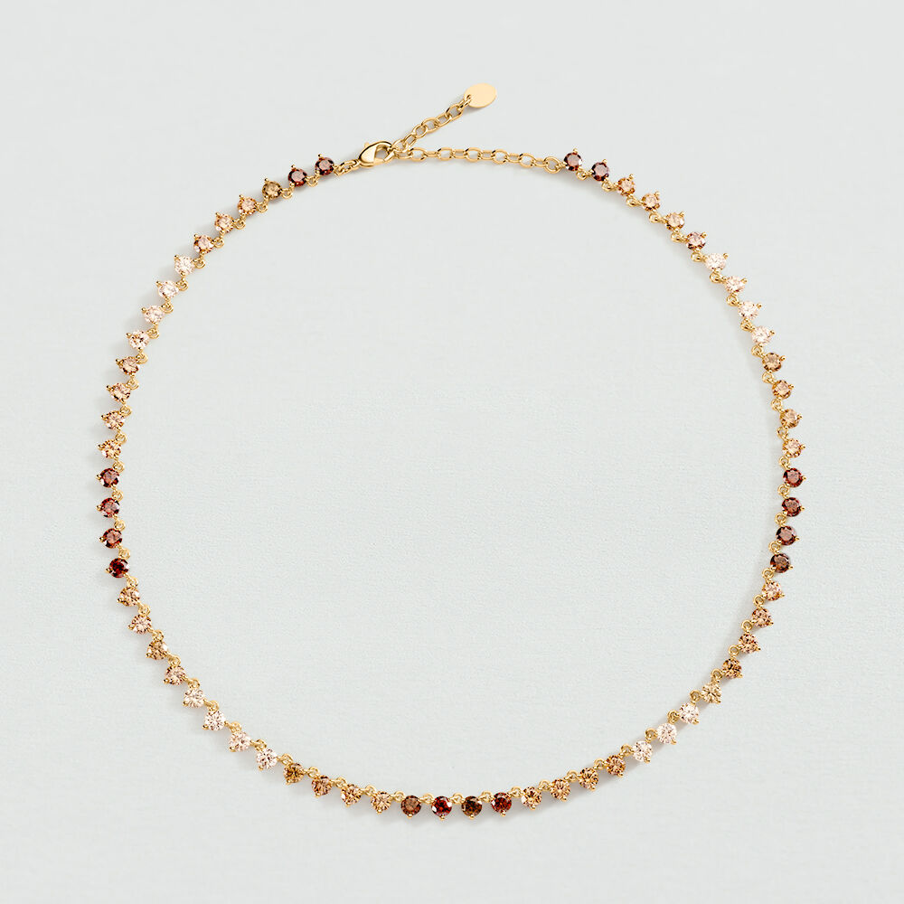 Ce collier de notre collection LUTETIA, imaginé à Paris, est réalisé en laiton doré à l'or 750/1000e - 18 carats, et orné d'oxydes de zirconium.Inspiré du style Art Déco, ce collier se distingue par de somptueux oxydes de grande taille aux teintes fumés. Ce bijou mesure 375mm et contient une rallonge de 50mm