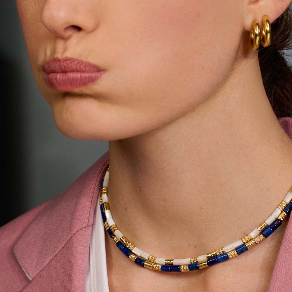 Collier court, en laiton doré 750/1000, tubes de pierres et en métal texturé.