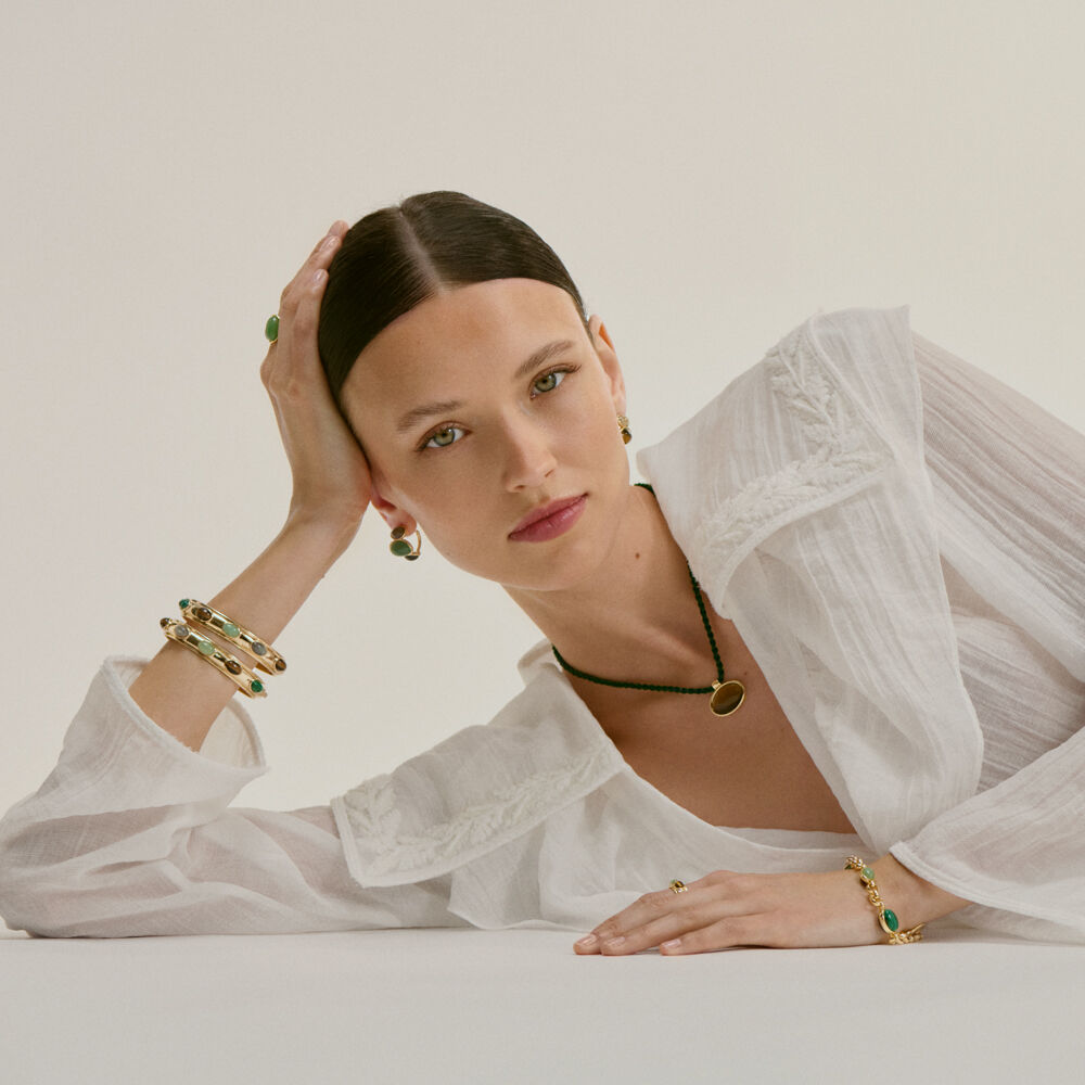 Collier court, en laiton doré 750/1000, cordon en soie tressé, pendentif avec une oeil de tigre ovale sertie.