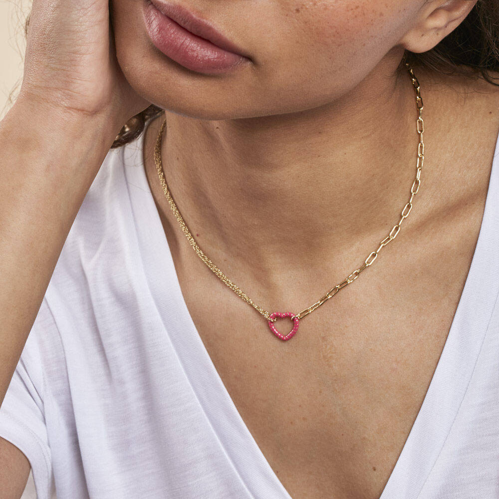 Collier court, en laiton doré, chaine torsade et rectangle, pendentif cœur avec un effet torsadé en émail.