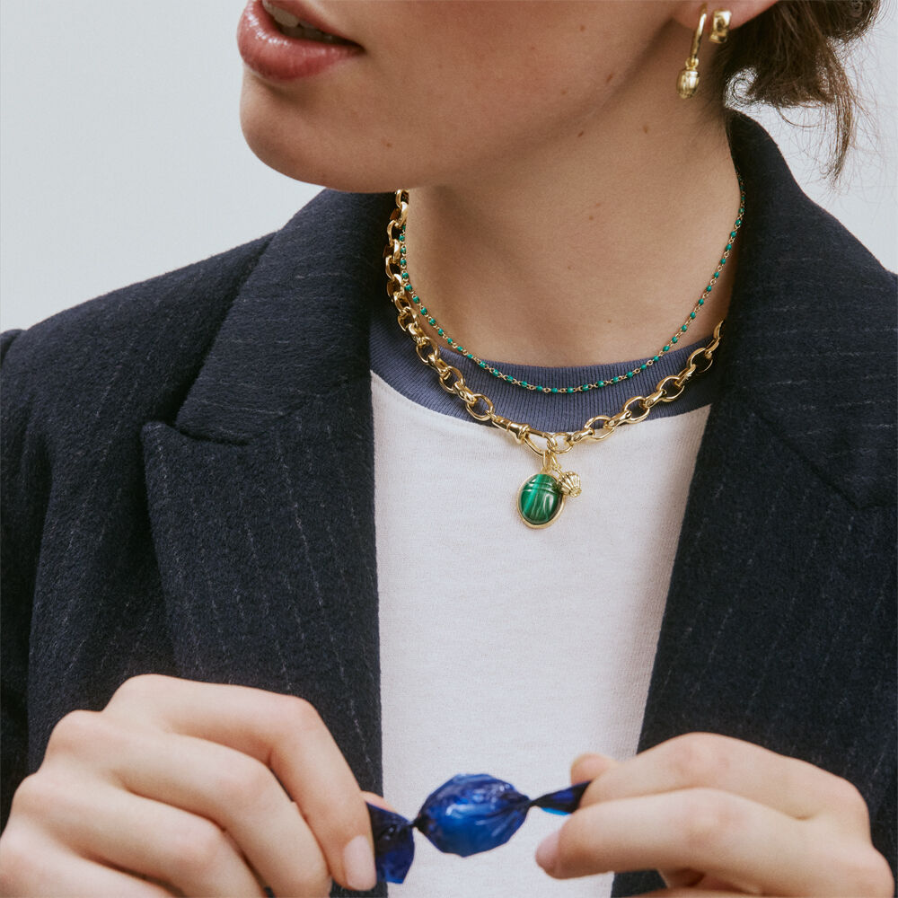 Ce collier de notre collection SMARTY, imaginé à Paris, est réalisé en acier inoxydable doré à l’or fin avec de petites billes d’émail coloré. Il est disponible en couleur argenté/doré, turquoise, vert, bordeaux, noir, corail, bleu ou blanc. Un bijou raffiné qui apporte une touche d’élégance à toutes vos tenues. Ce bijou mesure 375 mm auquel s’ajoute une rallonge de 50 mm