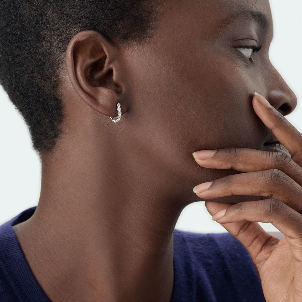Créoles de notre collection ODEON, imaginées à Paris, réalisées en argent 925 rhodié et ornées d'oxydes de zirconium en sertis clos. Cette collection au design épuré est inspirée des codes classiques de la joaillerie.