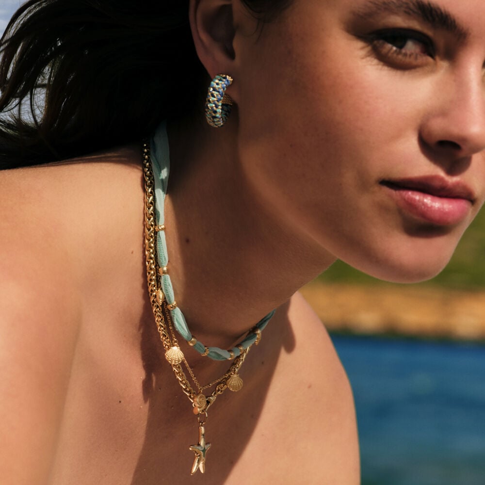 Petites créoles dorées avec raphia tressé de couleurs. Une proposition idéale pour l’été, stylée et facile à assortir, apportant une touche de couleur.