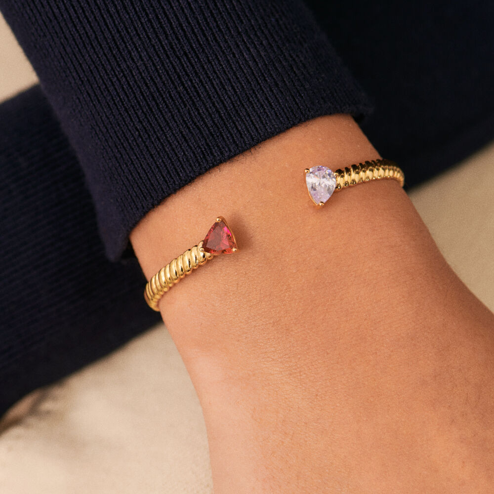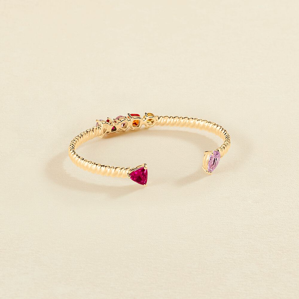 Jonc fin ouvert, en laiton doré 750/1000, fil torsadé et oxydes de zirconium de différentes formes sertis.