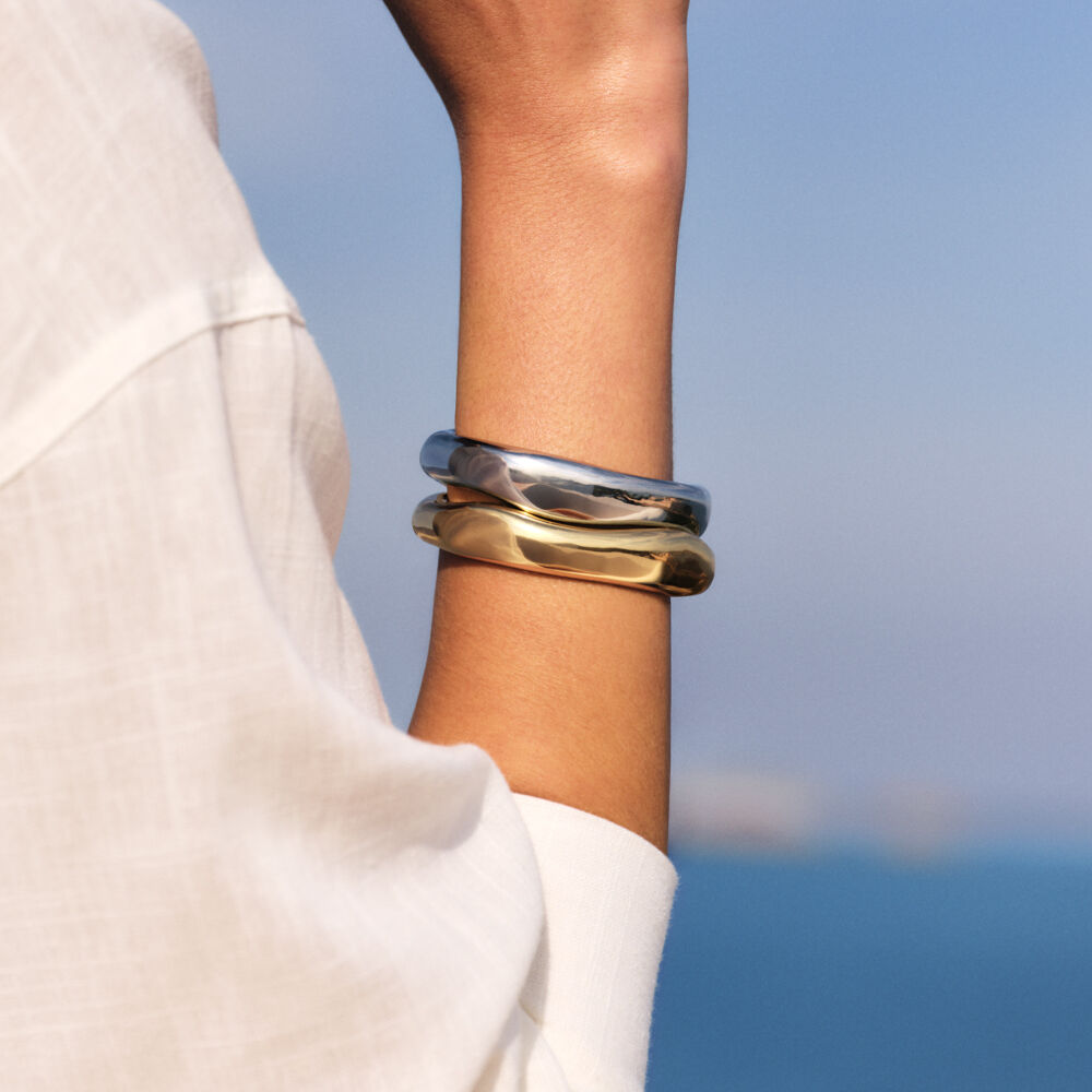 Bracelet jonc et organique en laiton rhodié. À porter seul pour un effet affirmé ou en accumulation avec d’autres pièces pour un look plus sophistiqué..