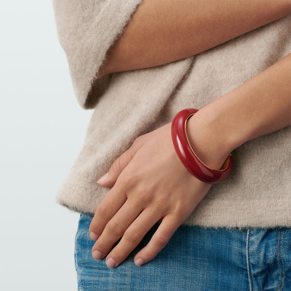 Ce jonc de notre collection PALAIS ROYAL, imaginé à Paris, est réalisé en laiton doré à l’or 750/1000e – 18 carats et acétate.Il est disponible en couleur Bordeaux, Ivoire ou Léopard.Produit iconique d’Agatha, ce jonc apporte une touche de couleur à vos tenues.